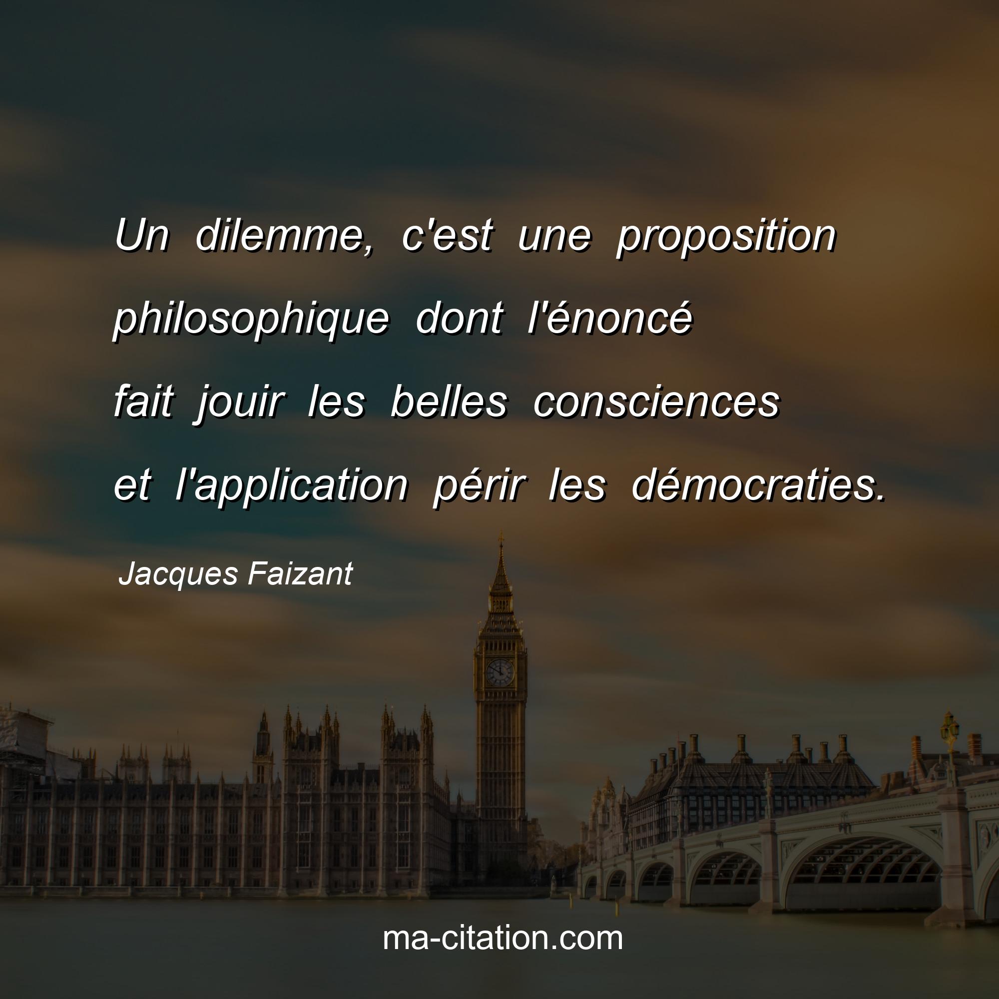 Citation sur la vie de Jacques Faizant :Un dilemme, c'est une proposition philosophique dont l'énoncé fait jouir les belles consciences et l'application périr les démocraties.