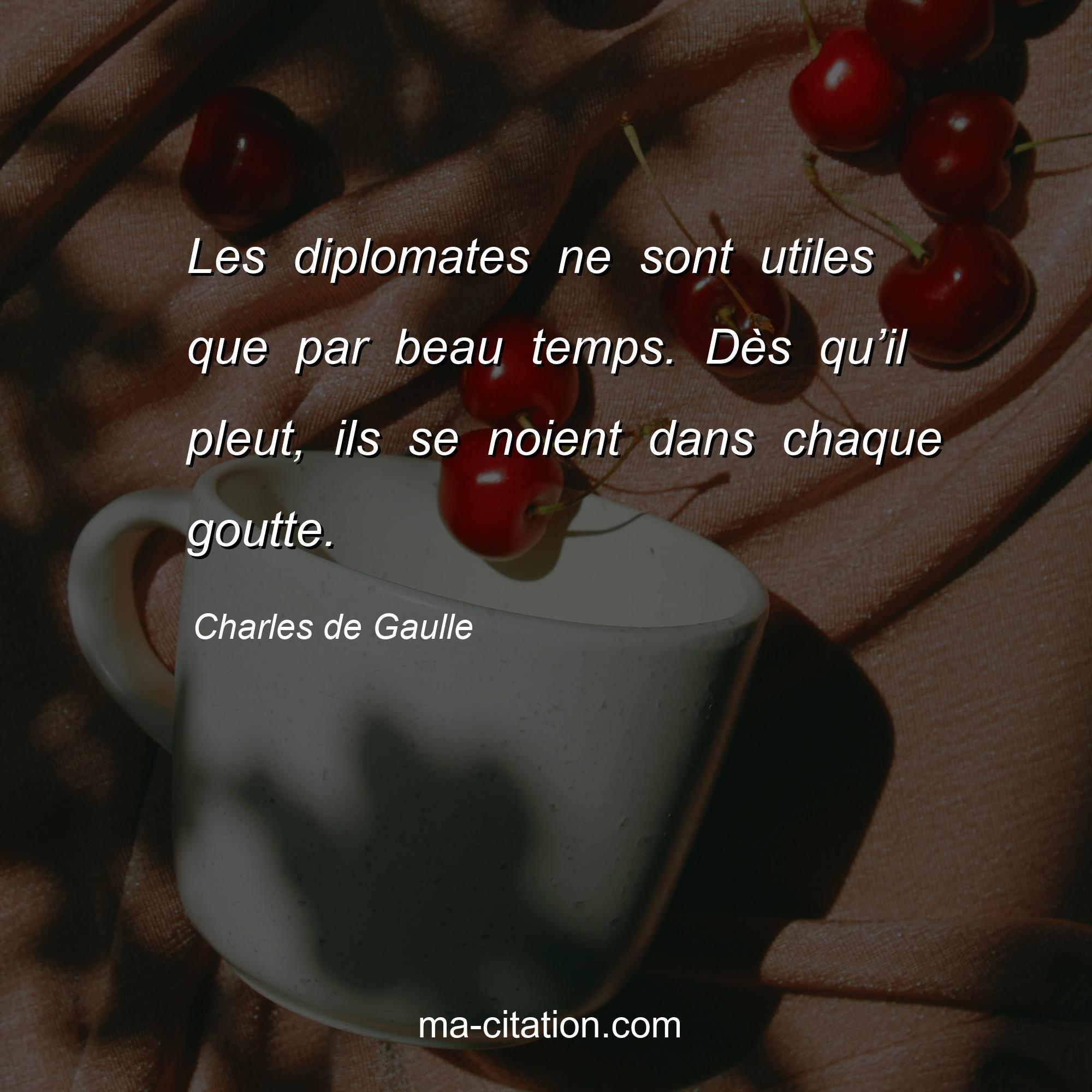 Citation sur la vie de Charles de Gaulle :Les diplomates ne sont utiles que par beau temps. Dès qu’il pleut, ils se noient dans chaque goutte.