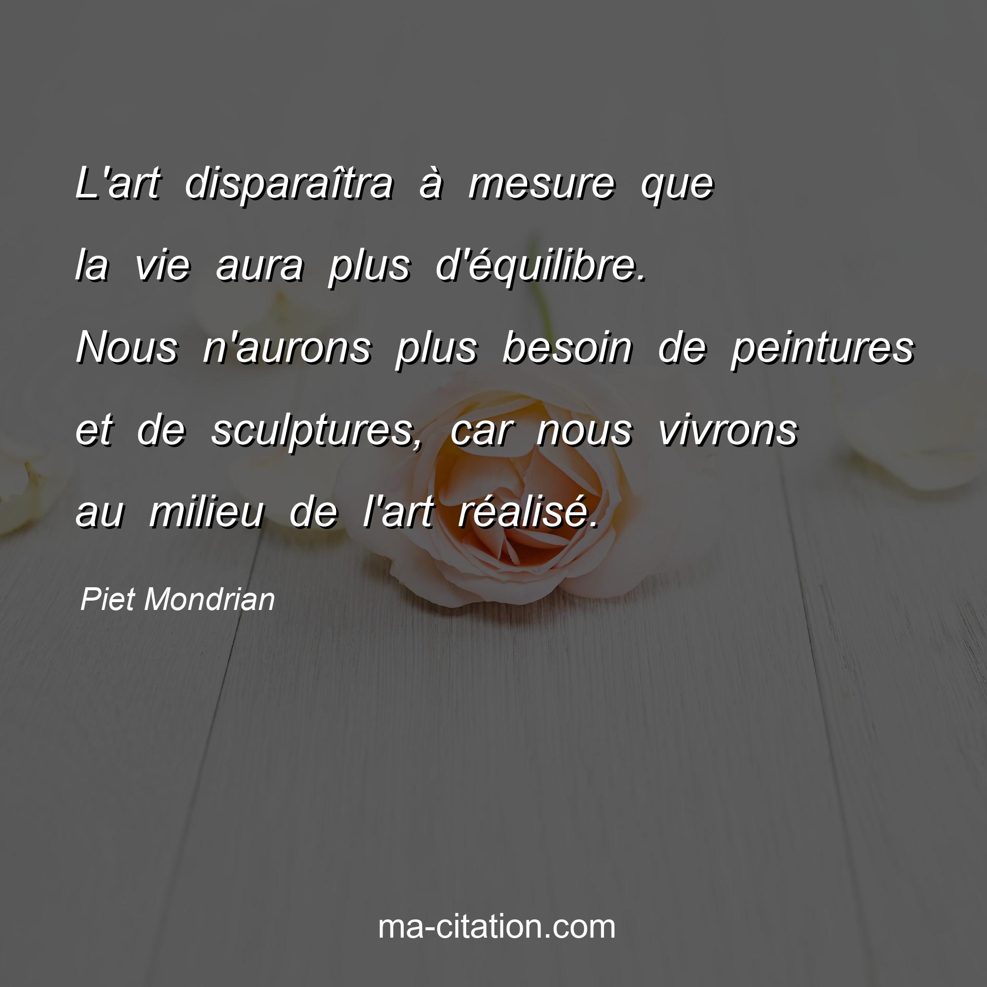Citation sur la vie de Piet Mondrian :L'art disparaîtra à mesure que la vie aura plus d'équilibre. Nous n'aurons plus besoin de peintures et de sculptures, car nous vivrons au milieu de l'art réalisé.