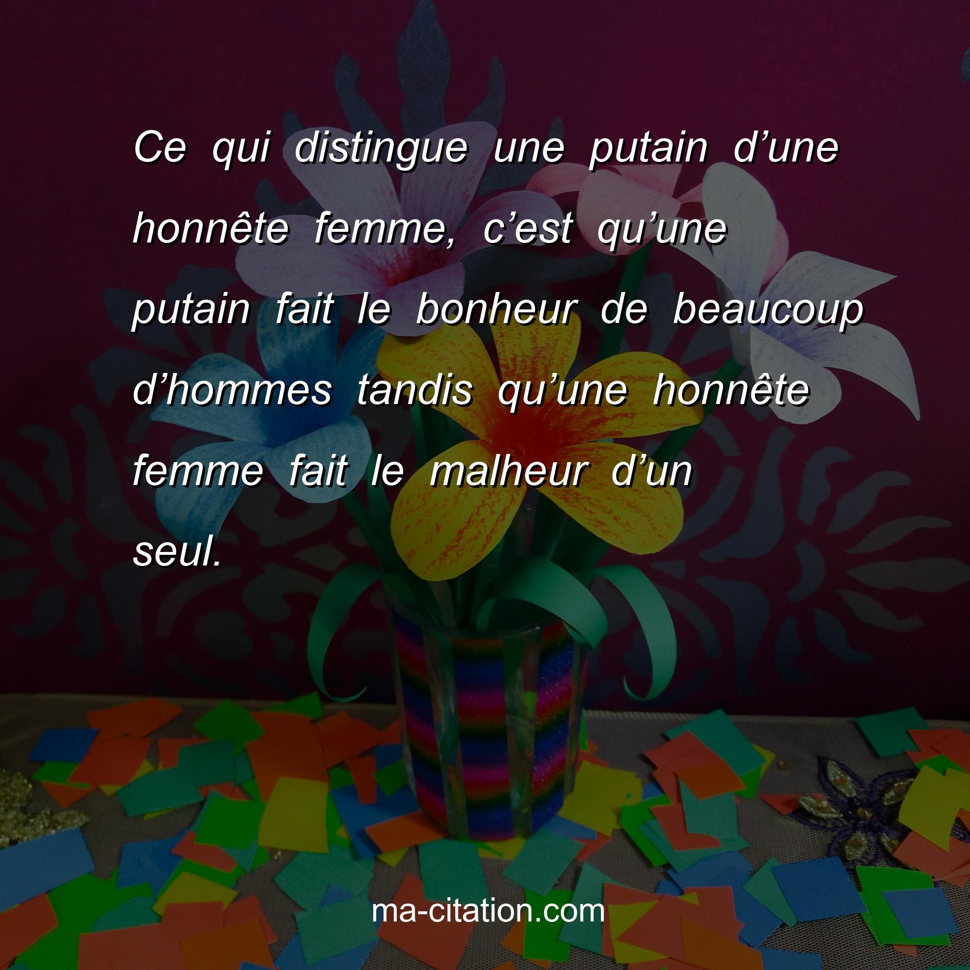 Citation sur la vie :Ce qui distingue une putain d’une honnête femme, c’est qu’une putain fait le bonheur de beaucoup d’hommes tandis qu’une honnête femme fait le malheur d’un seul.