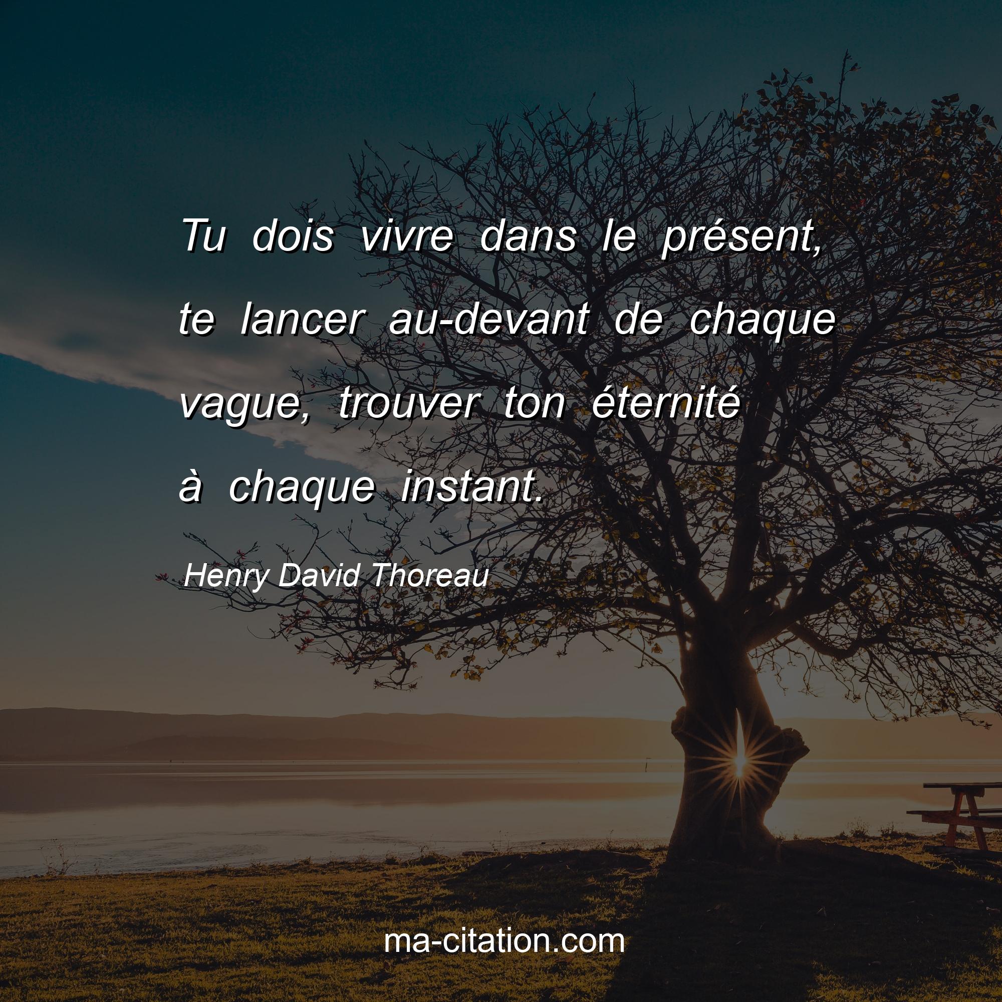 Citation sur la vie de Henry D. Thoreau :Tu dois vivre dans le présent, te lancer au-devant de chaque vague, trouver ton éternité à chaque instant.
