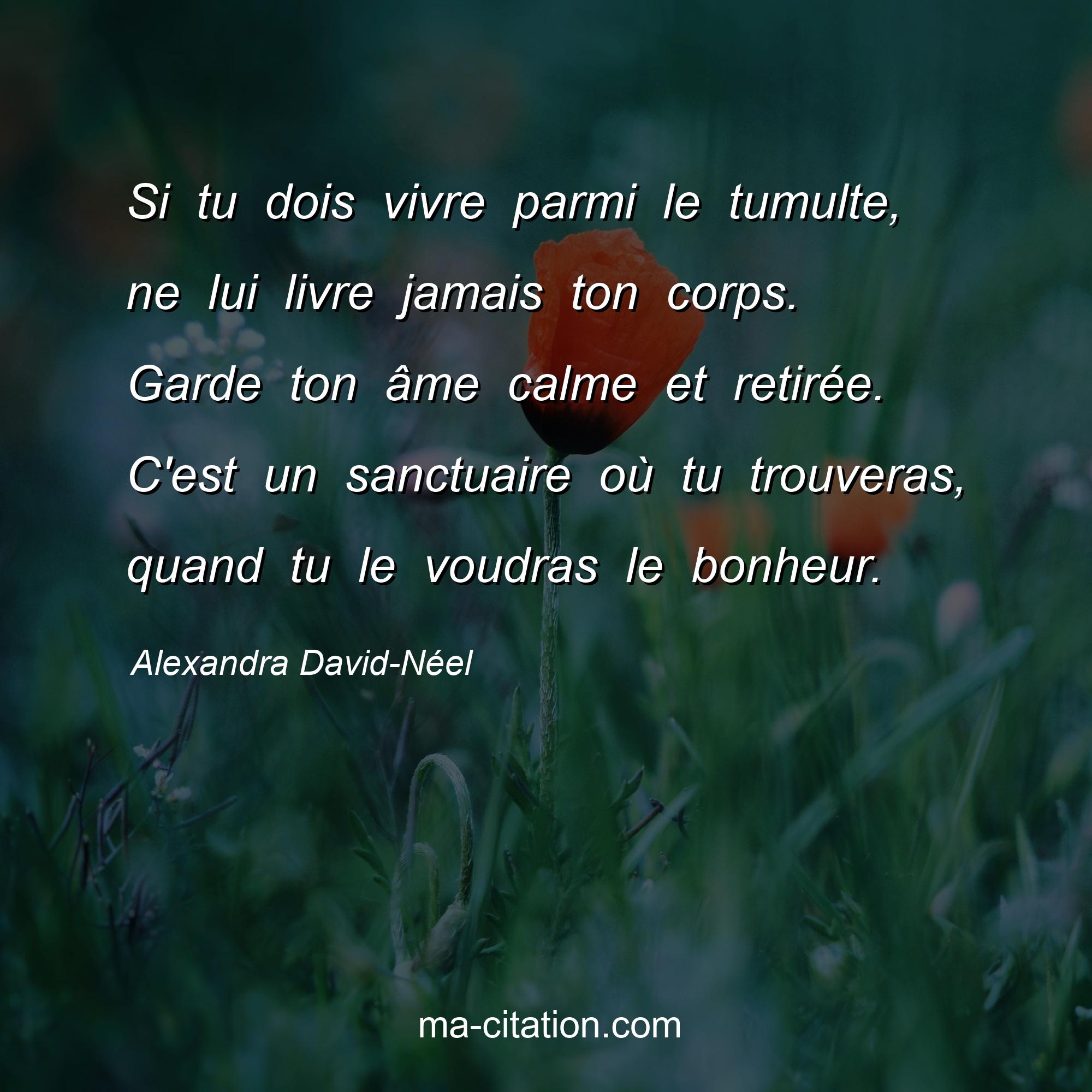 Citation sur la vie d'Alexandra David-Néel :Si tu dois vivre parmi le tumulte, ne lui livre jamais ton corps. Garde ton âme calme et retirée. C'est un sanctuaire où tu trouveras, quand tu le voudras le bonheur.