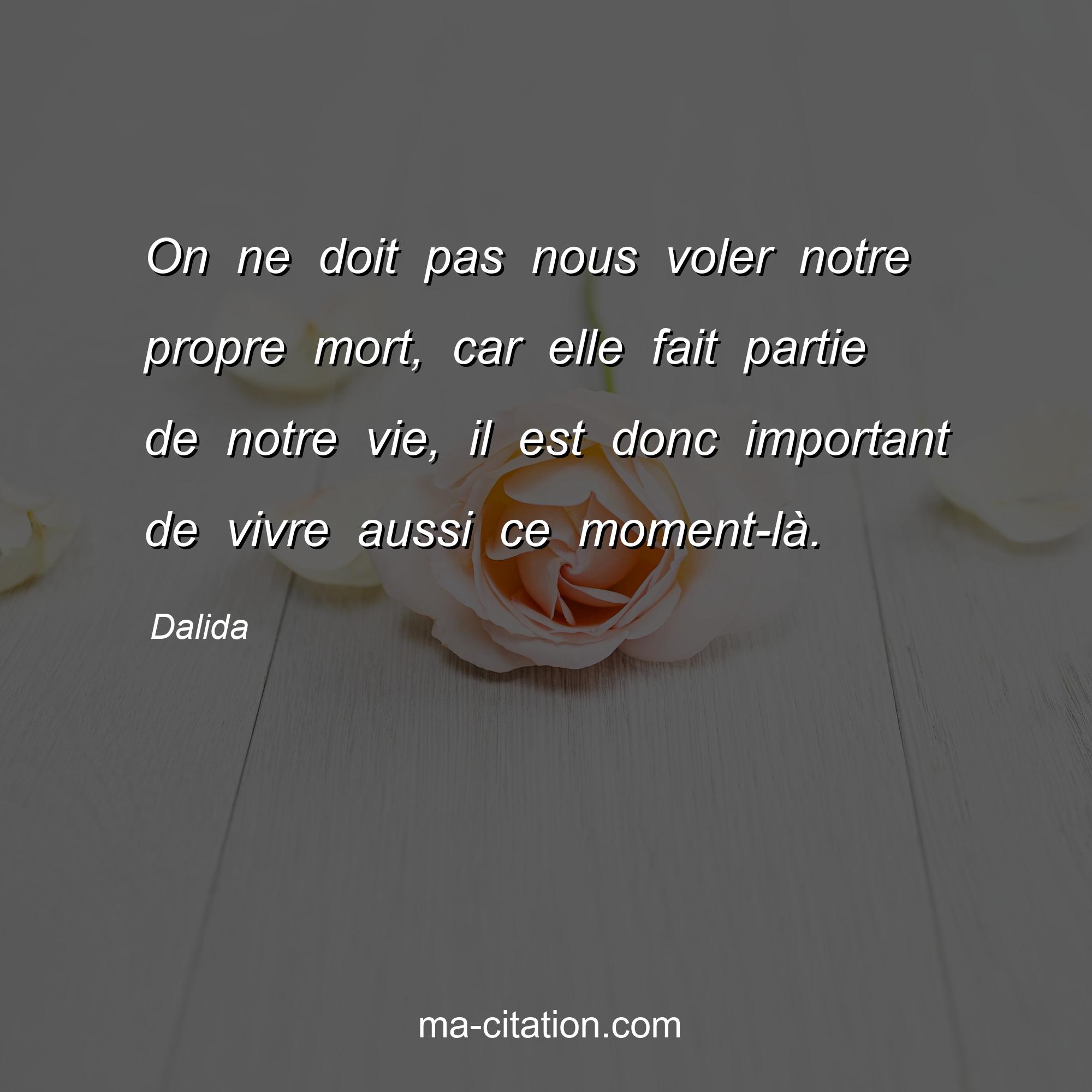 Citation sur la vie de Dalida :On ne doit pas nous voler notre propre mort, car elle fait partie de notre vie, il est donc important de vivre aussi ce moment-là .