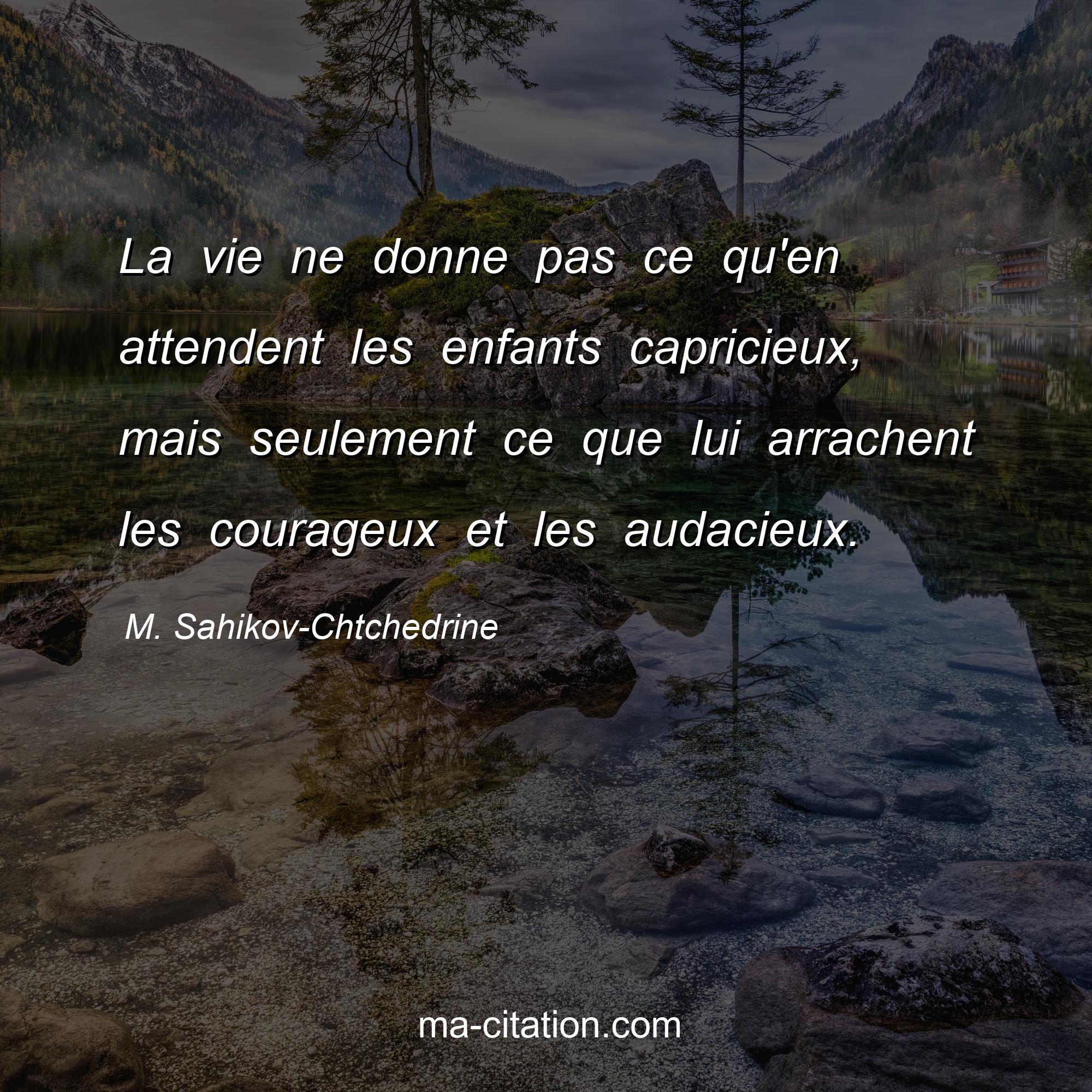 Citation sur la vie de M. Sahikov-Chtchedrine :La vie ne donne pas ce qu'en attendent les enfants capricieux, mais seulement ce que lui arrachent les courageux et les audacieux.