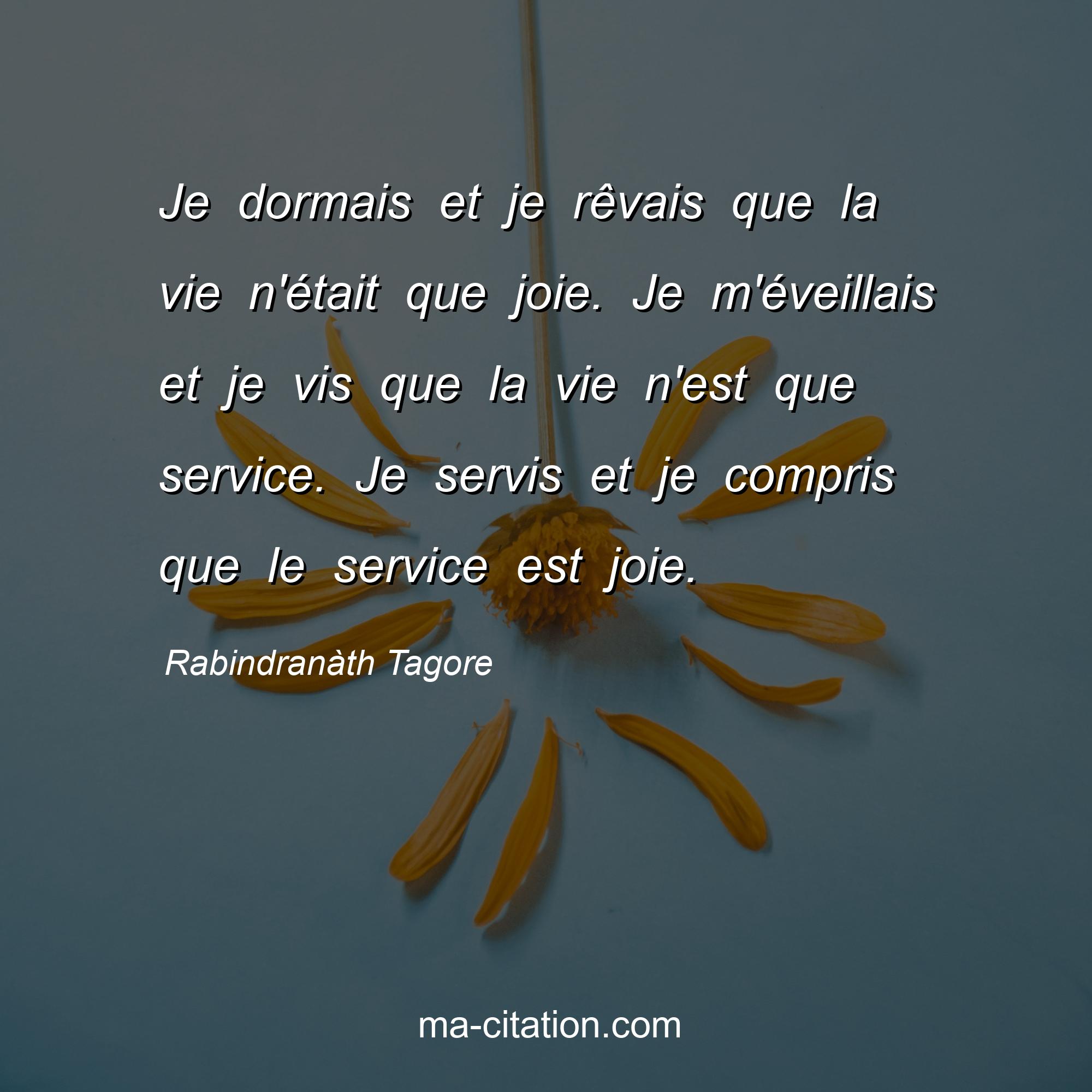 Rabindranà th Tagore est l'auteur de la citation sur la vie "Je dormais et je rêvais que la vie n'était que joie. Je m'éveillais et je vis que la vie n'est que service. Je servis et je compris que le service est joie.".