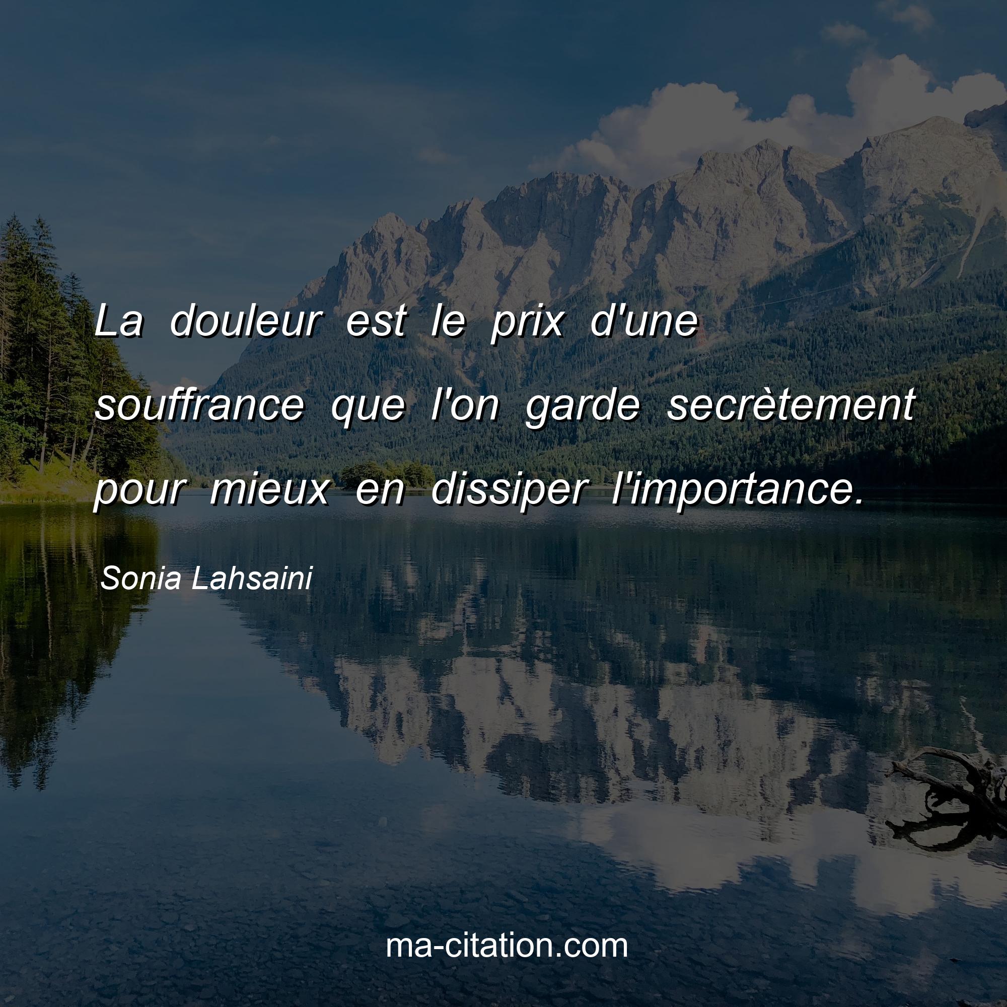 Citation sur la vie de Sonia Lahsaini :La douleur est le prix d'une souffrance que l'on garde secrètement pour mieux en dissiper l'importance.