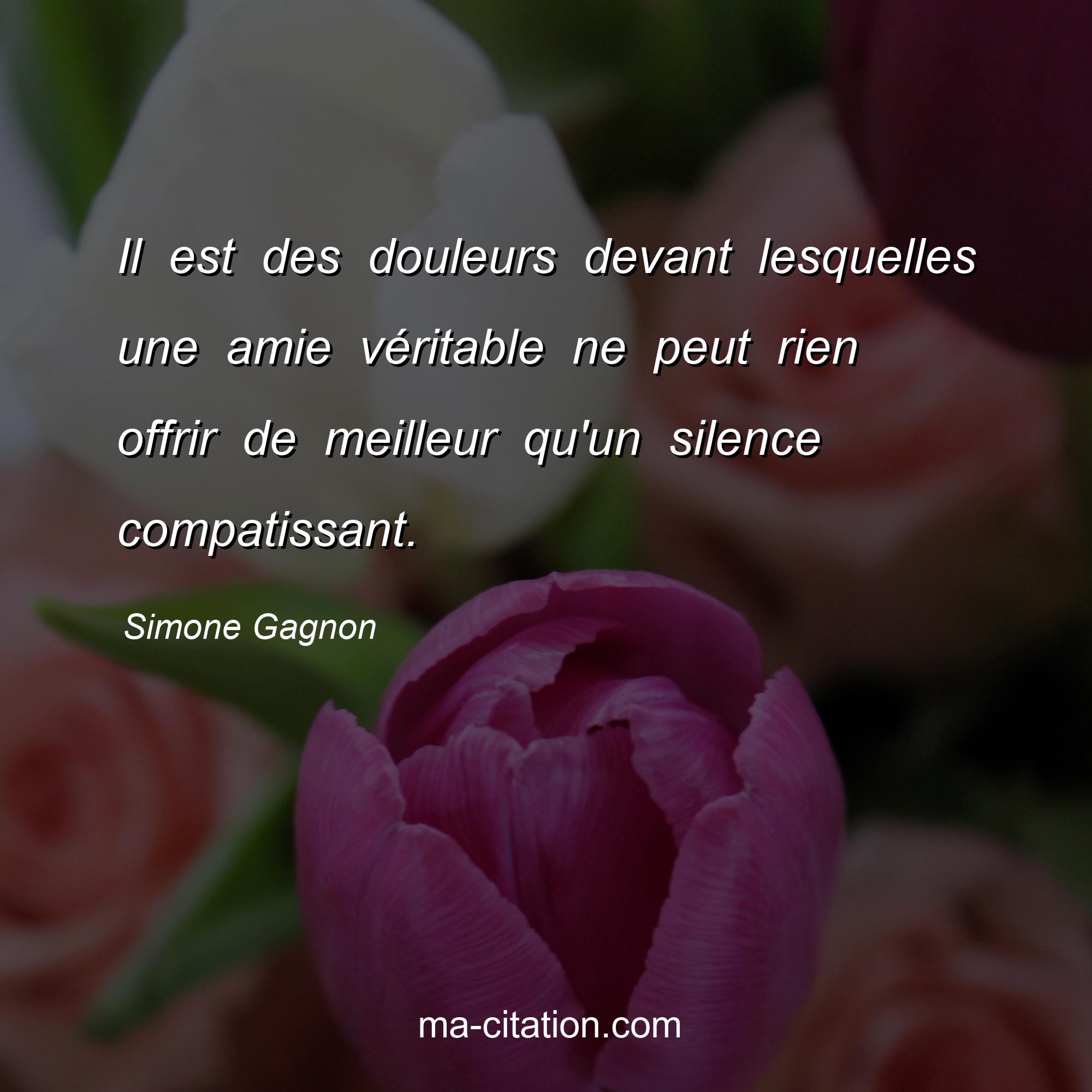 Simone Gagnon est l'auteur de la citation sur la vie "Il est des douleurs devant lesquelles une amie véritable ne peut rien offrir de meilleur qu'un silence compatissant.".
