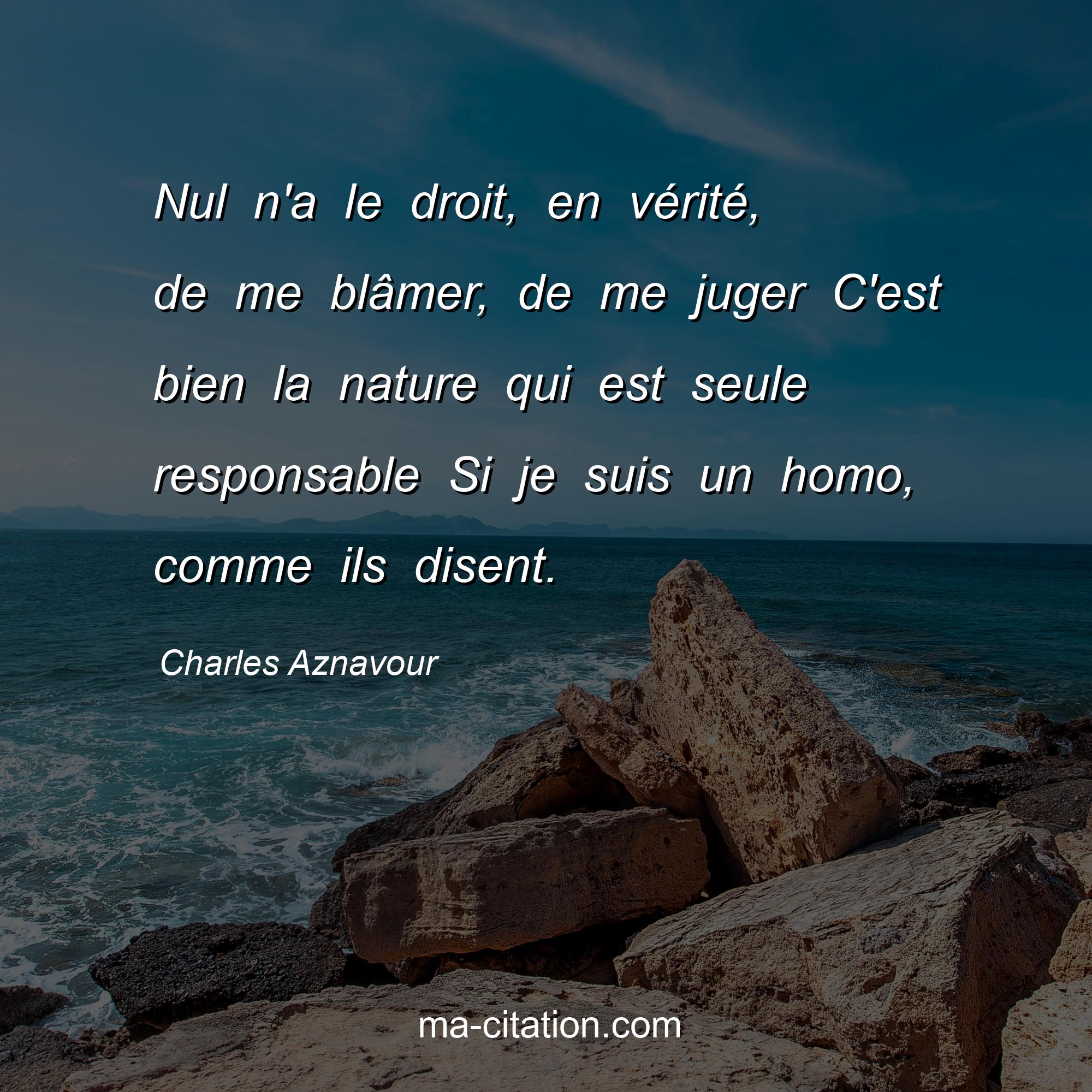 Citation sur la vie de Charles Aznavour :Nul n'a le droit, en vérité, de me blâmer, de me juger C'est bien la nature qui est seule responsable Si je suis un homo, comme ils disent.