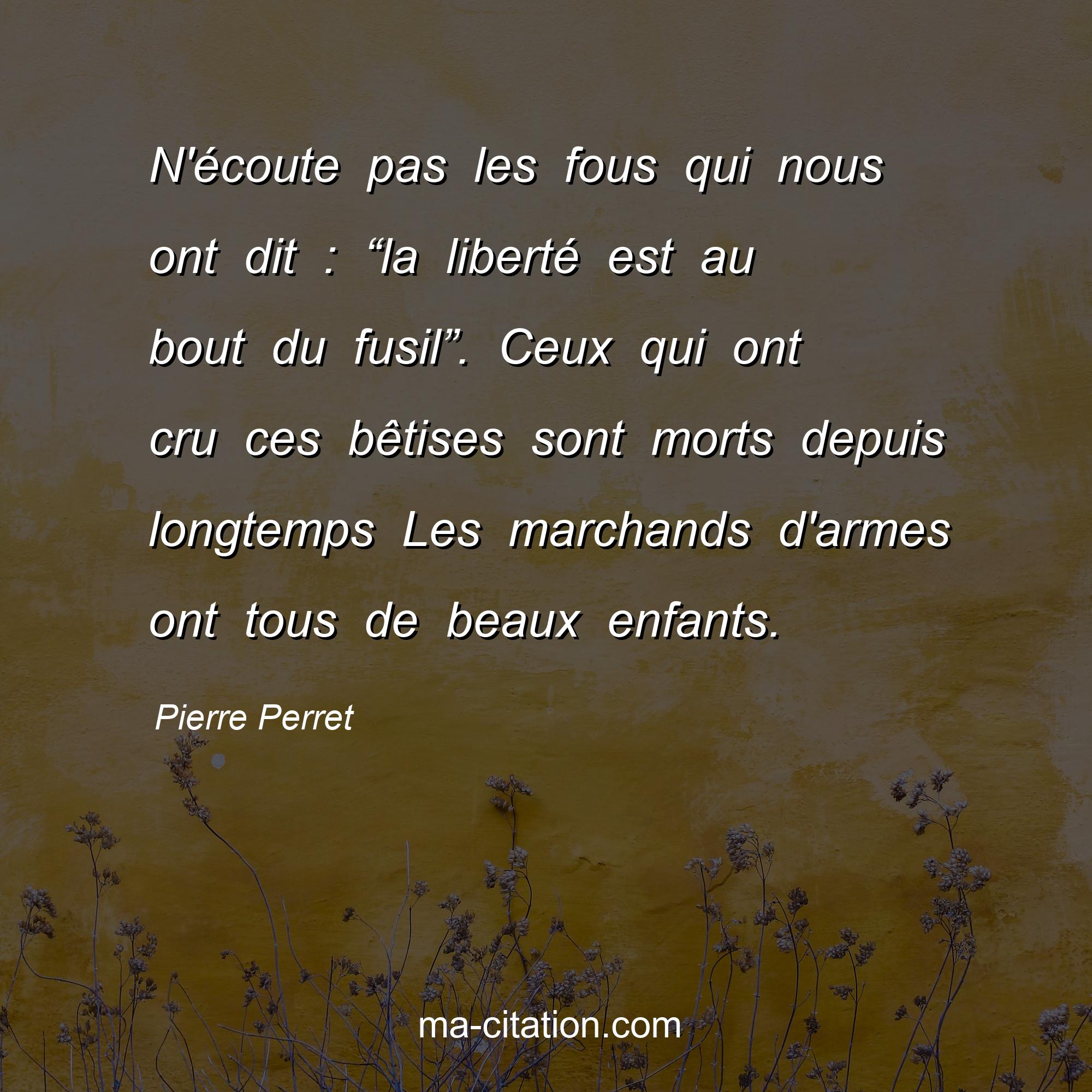 Citation sur la vie de Pierre Perret :N'écoute pas les fous qui nous ont dit : “la liberté est au bout du fusilâ€. Ceux qui ont cru ces bêtises sont morts depuis longtemps Les marchands d'armes ont tous de beaux enfants.