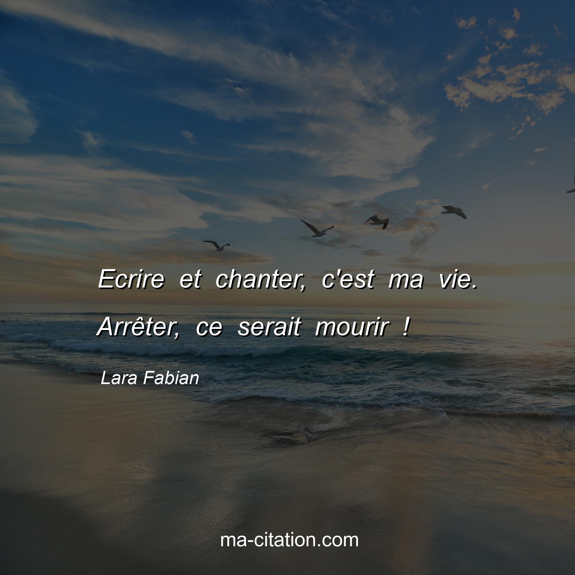 Lara Fabian est l'auteur de la citation sur la vie "Ecrire et chanter, c'est ma vie. Arrêter, ce serait mourir !".