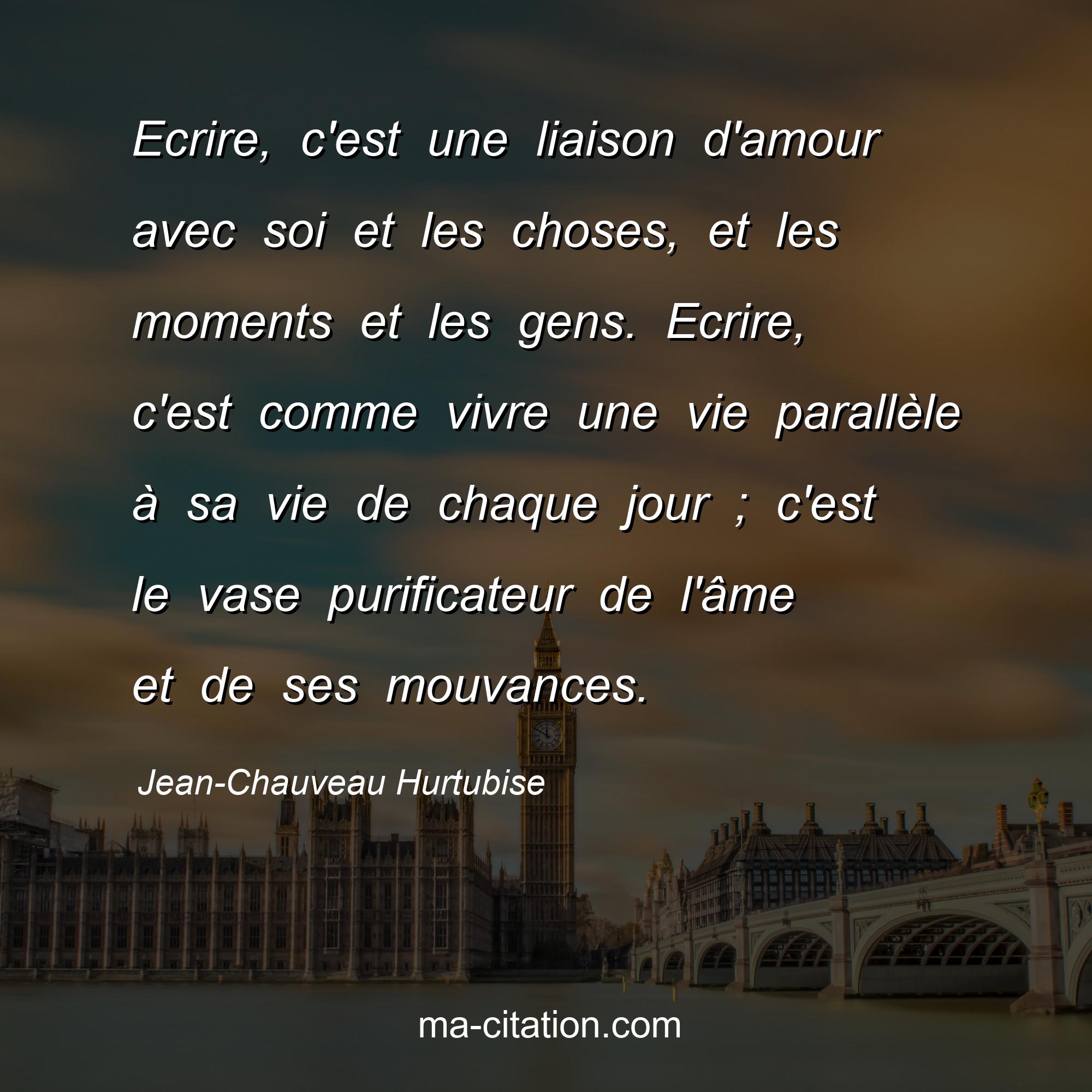 Citation sur la vie de Jean-Chauveau Hurtubise :Ecrire, c'est une liaison d'amour avec soi et les choses, et les moments et les gens. Ecrire, c'est comme vivre une vie parallèle à sa vie de chaque jour ; c'est le vase purificateur de l'âme et de ses mouvances.