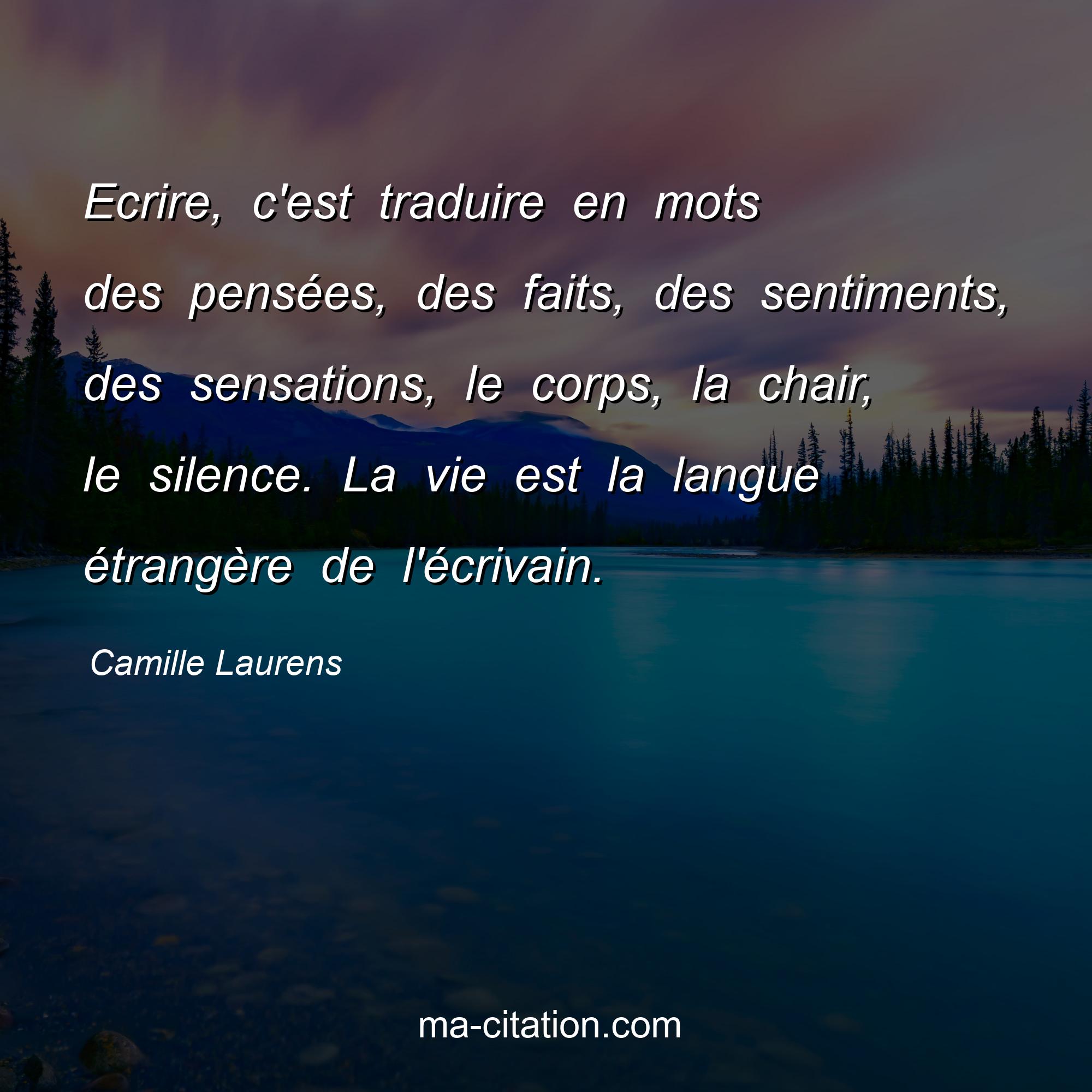 Citation sur la vie de Camille Laurens :Ecrire, c'est traduire en mots des pensées, des faits, des sentiments, des sensations, le corps, la chair, le silence. La vie est la langue étrangère de l'écrivain.