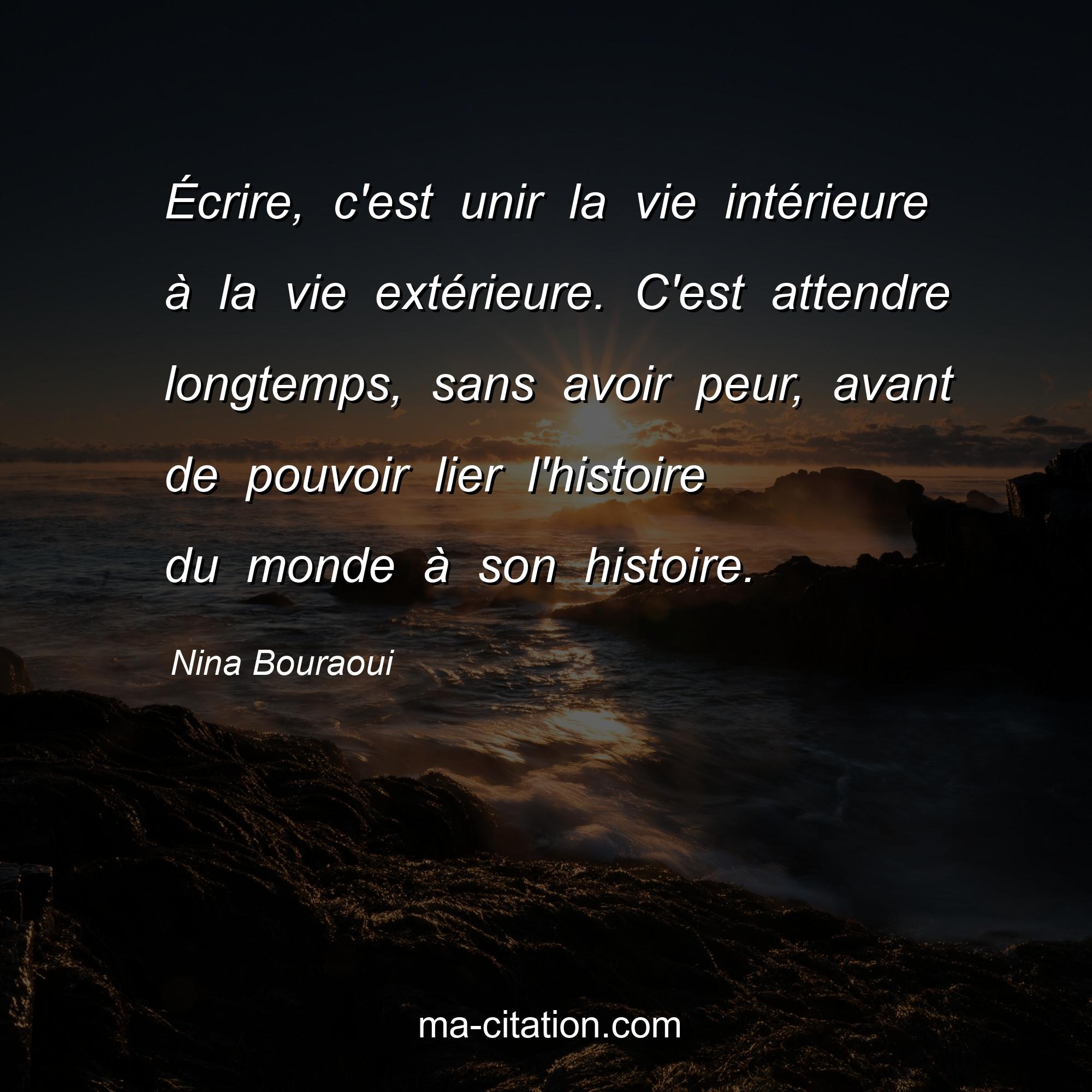 Nina Bouraoui est l'auteur de la citation sur la vie "Écrire, c'est unir la vie intérieure à la vie extérieure. C'est attendre longtemps, sans avoir peur, avant de pouvoir lier l'histoire du monde à son histoire.".
