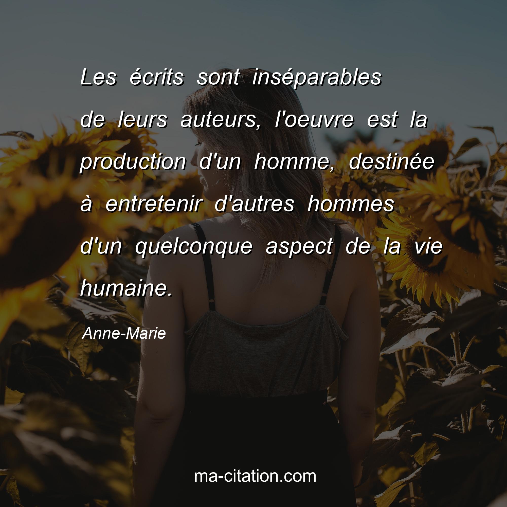 Anne-Marie est l'auteur de la citation sur la vie "Les écrits sont inséparables de leurs auteurs, l'oeuvre est la production d'un homme, destinée à entretenir d'autres hommes d'un quelconque aspect de la vie humaine.".