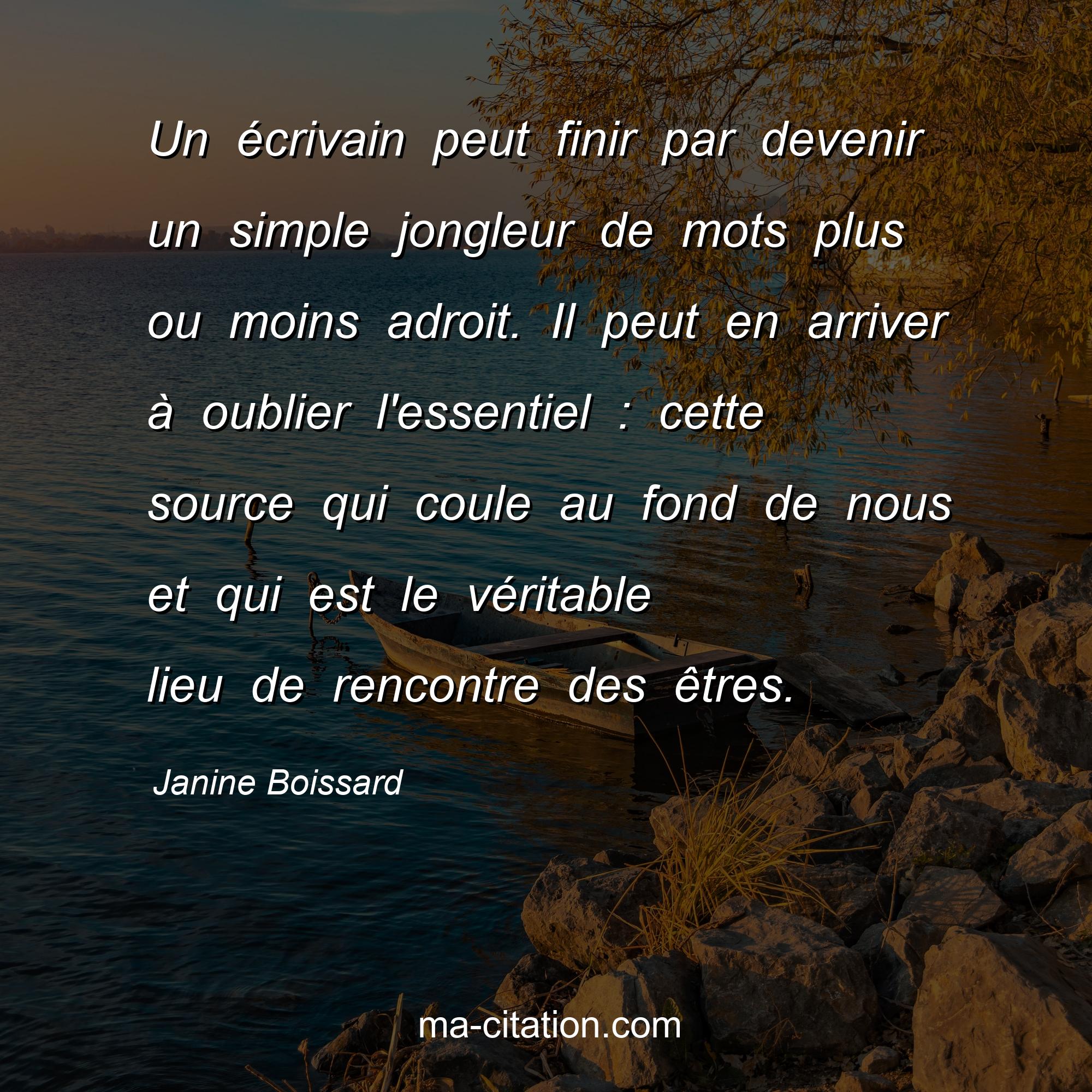 Citation sur la vie de Janine Boissard :Un écrivain peut finir par devenir un simple jongleur de mots plus ou moins adroit. Il peut en arriver à oublier l'essentiel : cette source qui coule au fond de nous et qui est le véritable lieu de rencontre des êtres.