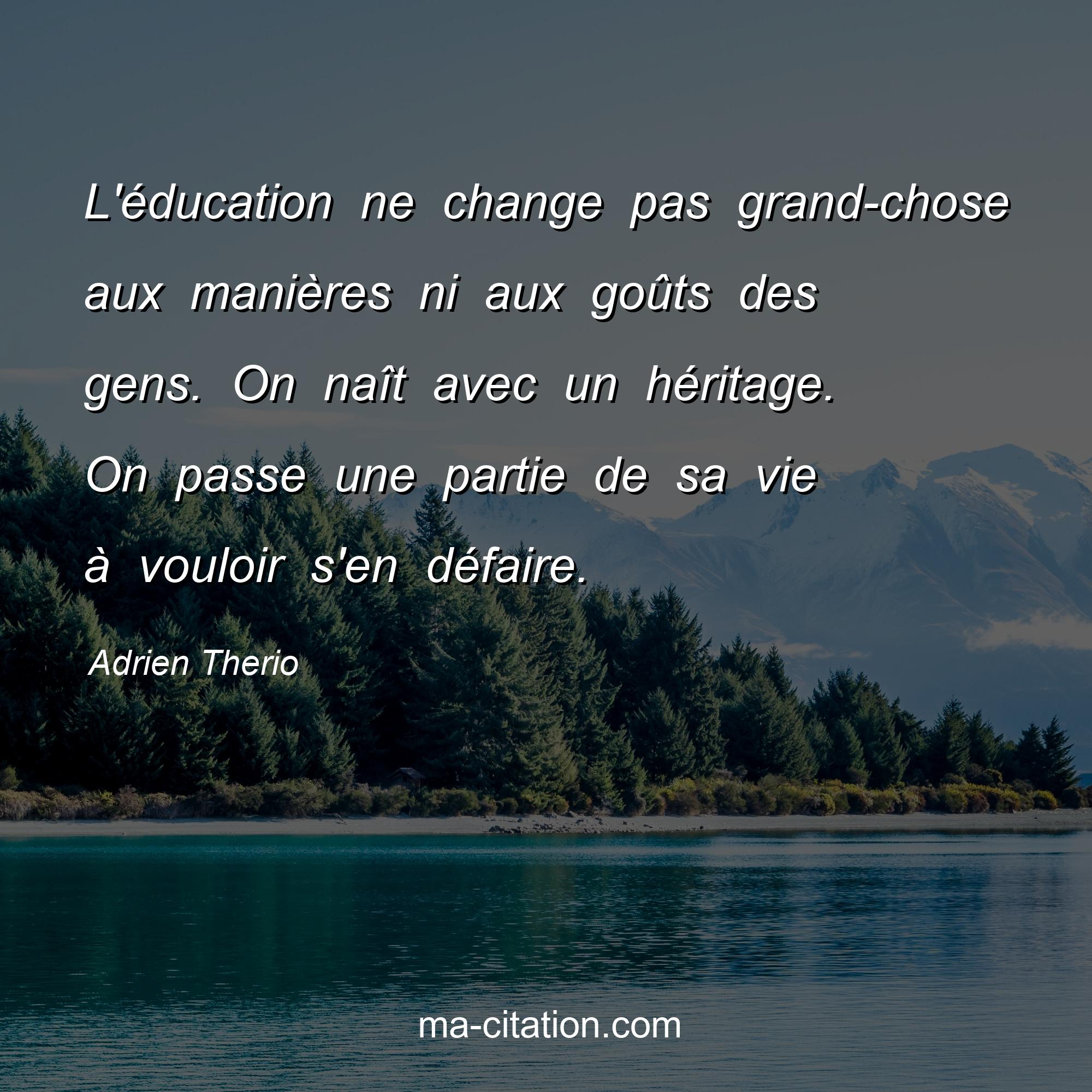 Adrien Therio est l'auteur de la citation sur la vie "L'éducation ne change pas grand-chose aux manières ni aux goûts des gens. On naît avec un héritage. On passe une partie de sa vie à vouloir s'en défaire.".