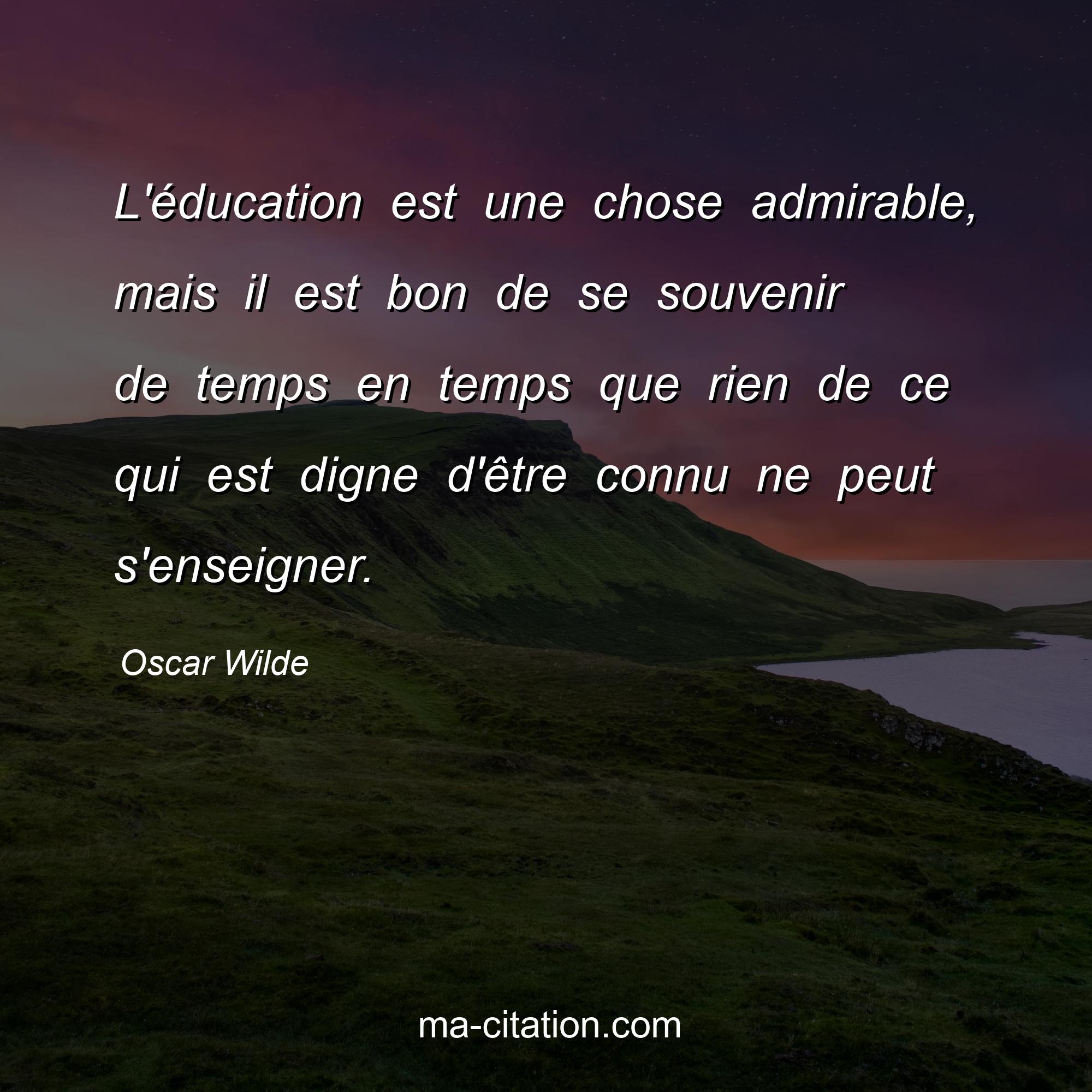 Citation sur la vie d'Oscar Wilde :L'éducation est une chose admirable, mais il est bon de se souvenir de temps en temps que rien de ce qui est digne d'être connu ne peut s'enseigner.