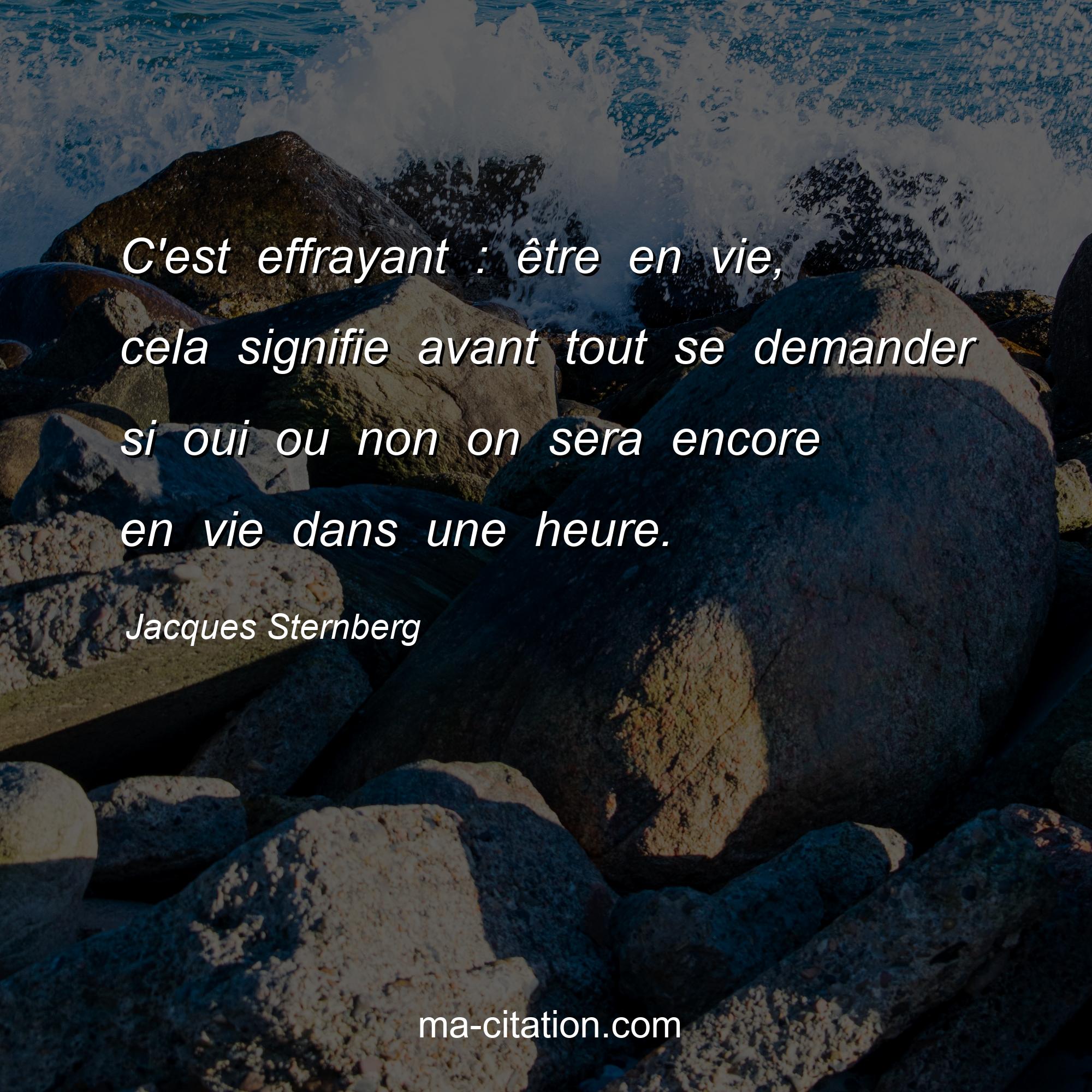 Citation sur la vie de Jacques Sternberg :C'est effrayant : être en vie, cela signifie avant tout se demander si oui ou non on sera encore en vie dans une heure.