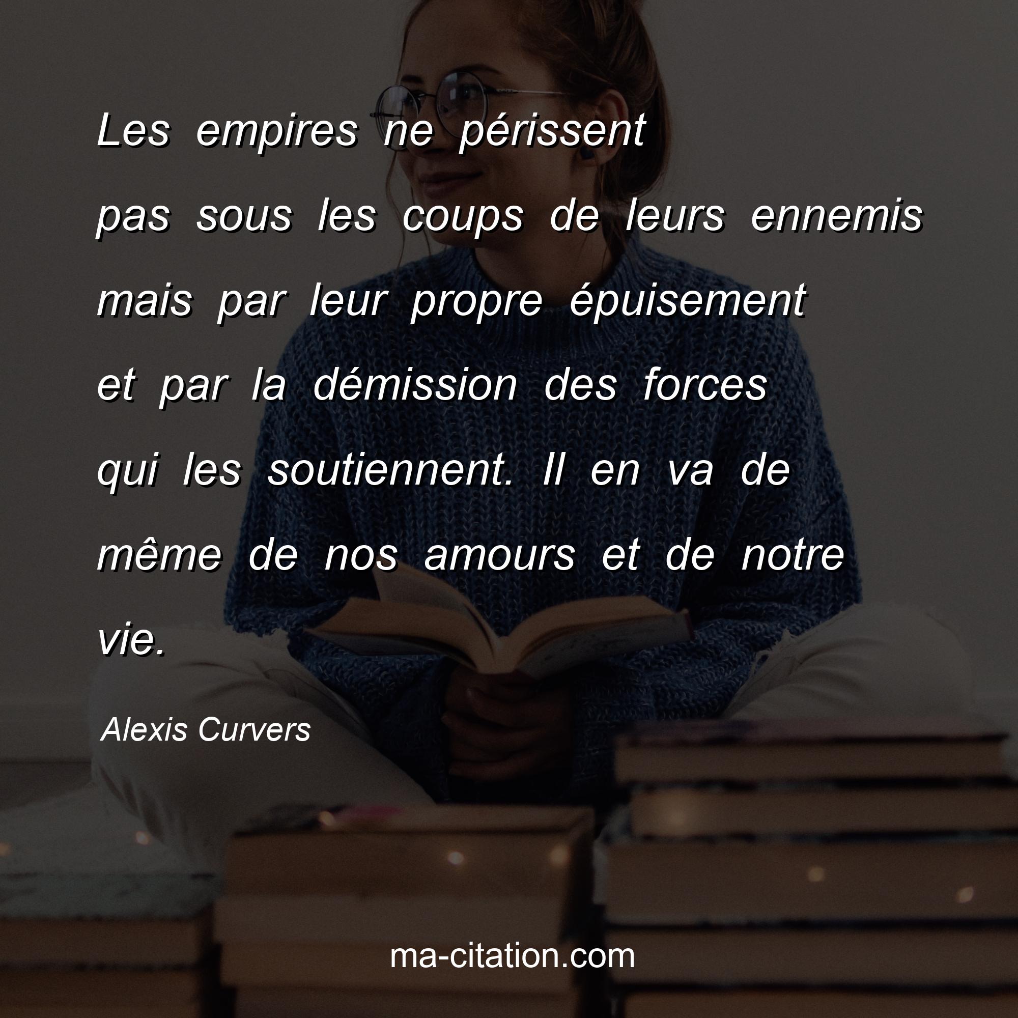 Citation sur la vie d'Alexis Curvers :Les empires ne périssent pas sous les coups de leurs ennemis mais par leur propre épuisement et par la démission des forces qui les soutiennent. Il en va de même de nos amours et de notre vie.