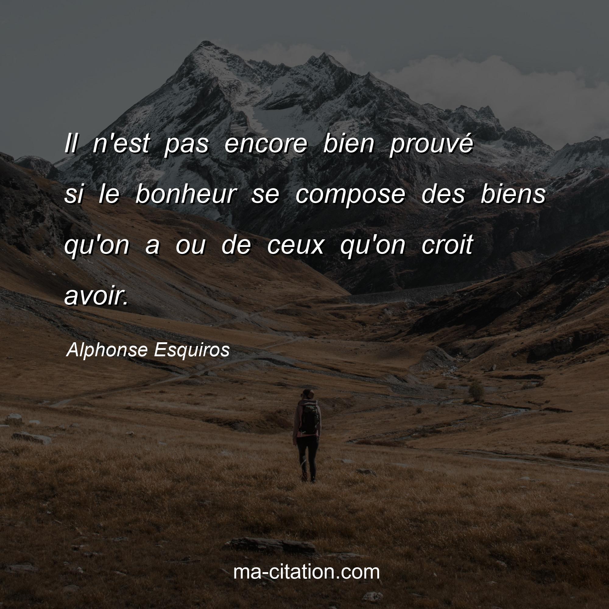 Citation sur la vie d'Alphonse Esquiros :Il n'est pas encore bien prouvé si le bonheur se compose des biens qu'on a ou de ceux qu'on croit avoir.