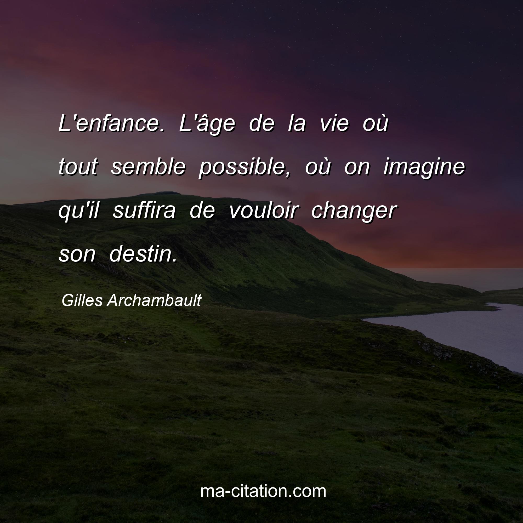 Gilles Archambault est l'auteur de la citation sur la vie "L'enfance. L'âge de la vie où tout semble possible, où on imagine qu'il suffira de vouloir changer son destin.".