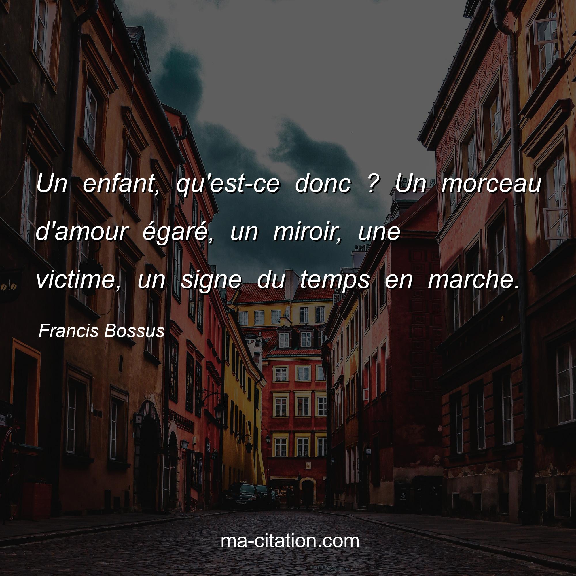 Citation sur la vie de Francis Bossus :Un enfant, qu'est-ce donc ? Un morceau d'amour égaré, un miroir, une victime, un signe du temps en marche.