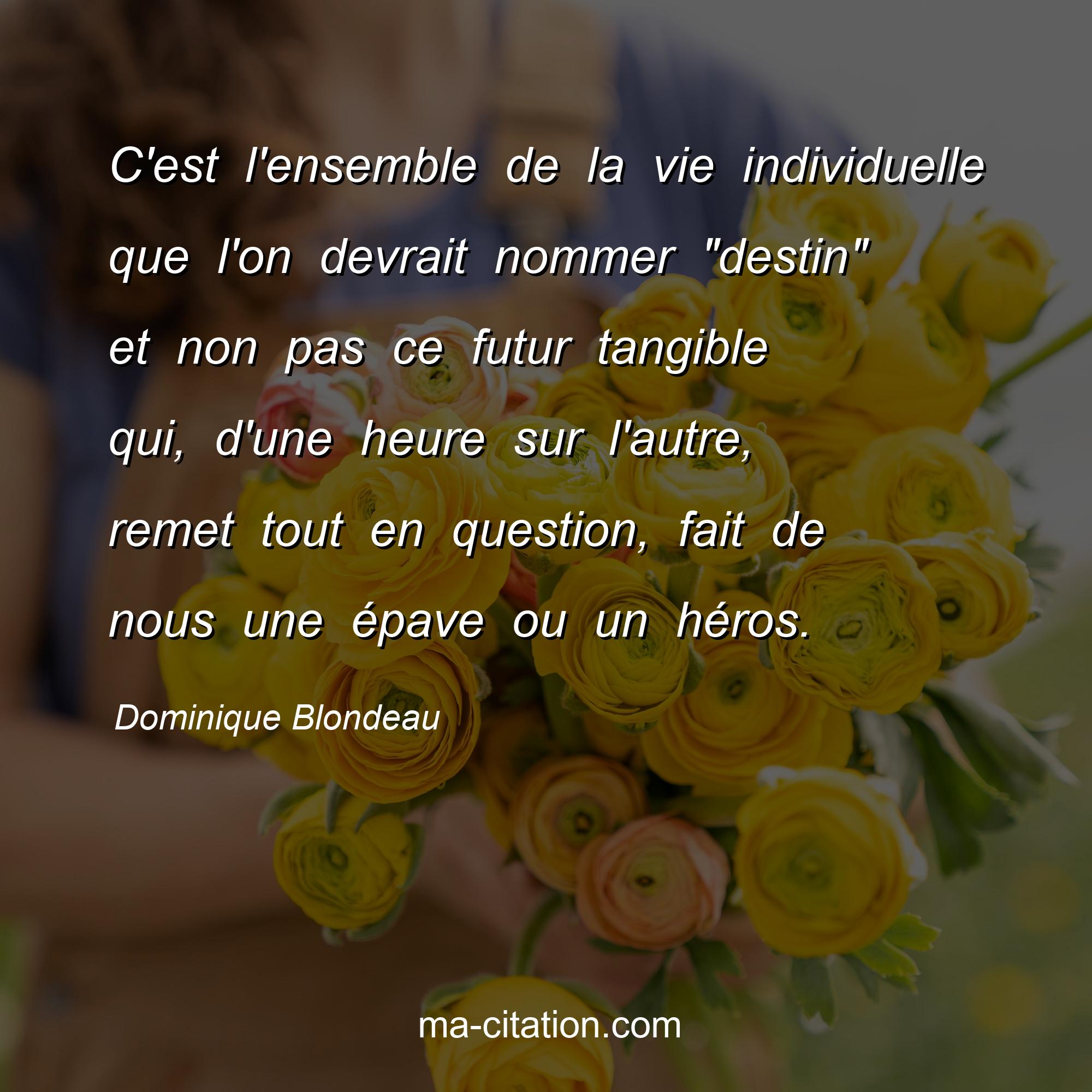 Citation sur la vie de Dominique Blondeau :C'est l'ensemble de la vie individuelle que l'on devrait nommer "destin" et non pas ce futur tangible qui, d'une heure sur l'autre, remet tout en question, fait de nous une épave ou un héros.