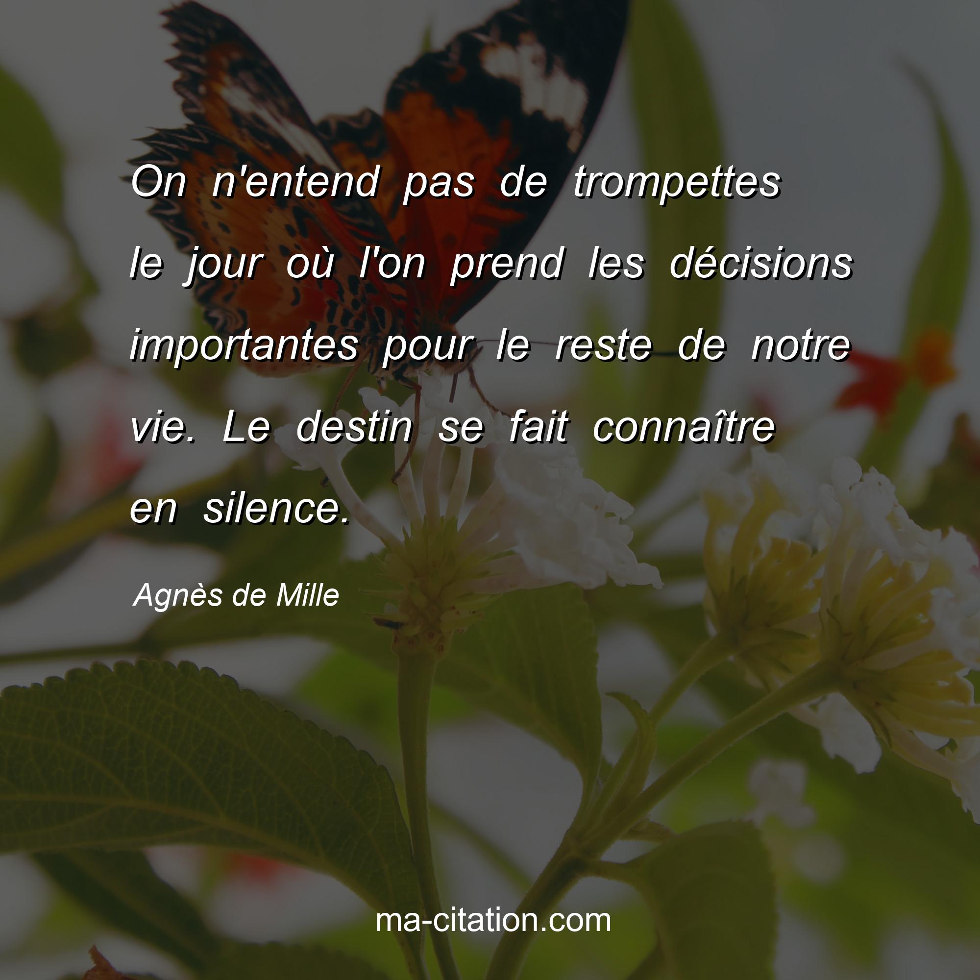 Agnès de Mille est l'auteur de la citation sur la vie "On n'entend pas de trompettes le jour où l'on prend les décisions importantes pour le reste de notre vie. Le destin se fait connaître en silence.".