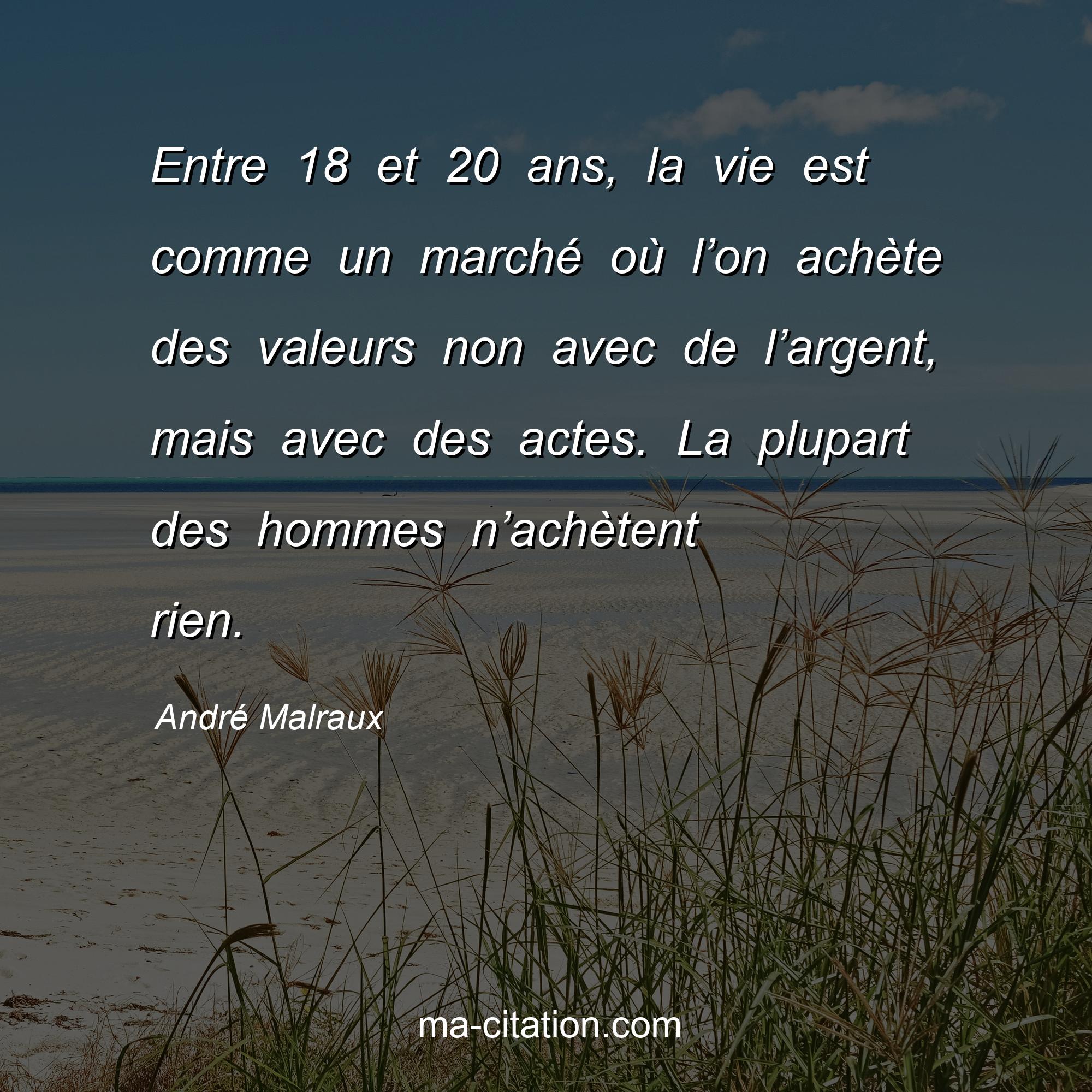 Citation sur la vie d'André Malraux :Entre 18 et 20 ans, la vie est comme un marché où l’on achète des valeurs non avec de l’argent, mais avec des actes. La plupart des hommes n’achètent rien.