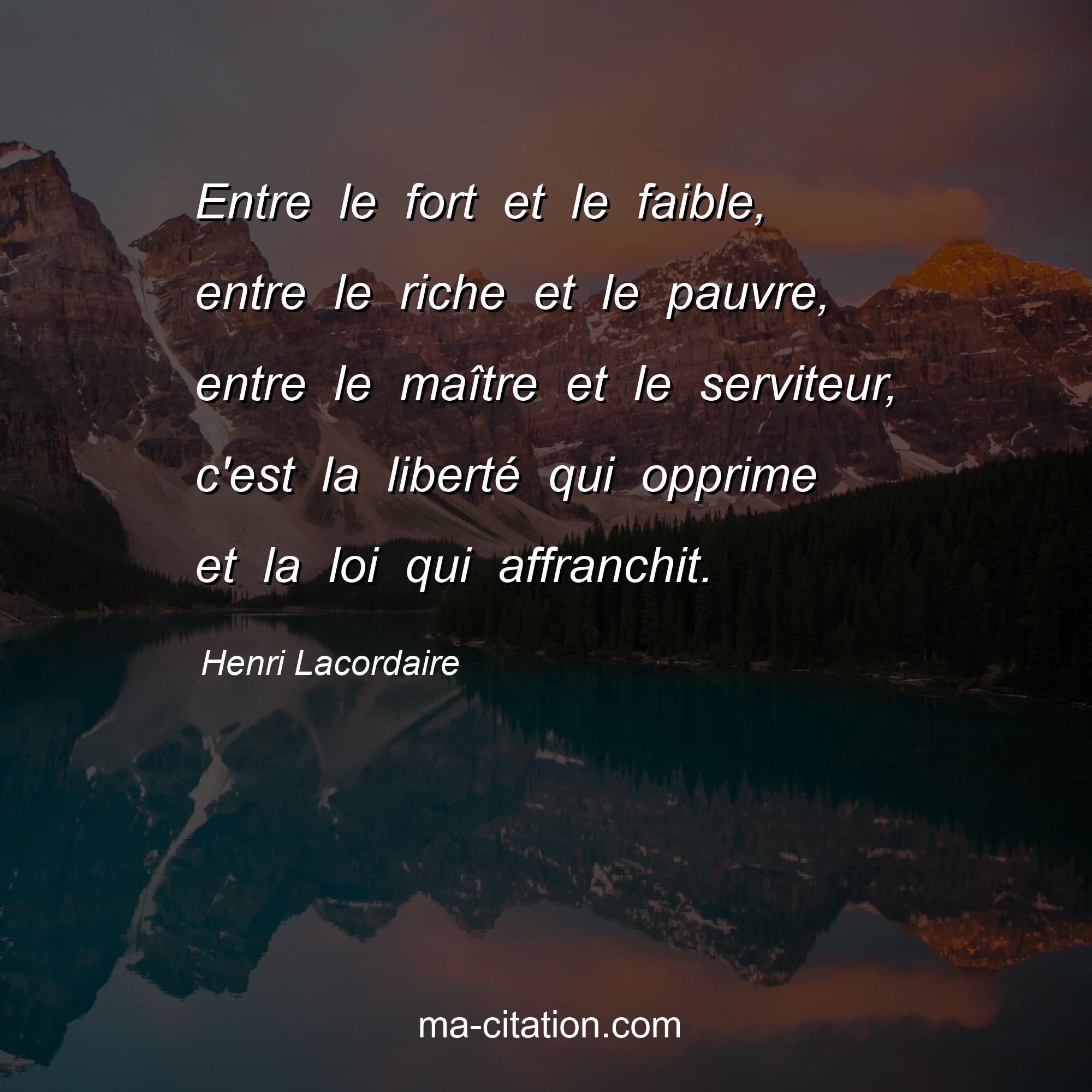 Citation sur la vie de Henri Lacordaire :Entre le fort et le faible, entre le riche et le pauvre, entre le maître et le serviteur, c'est la liberté qui opprime et la loi qui affranchit.