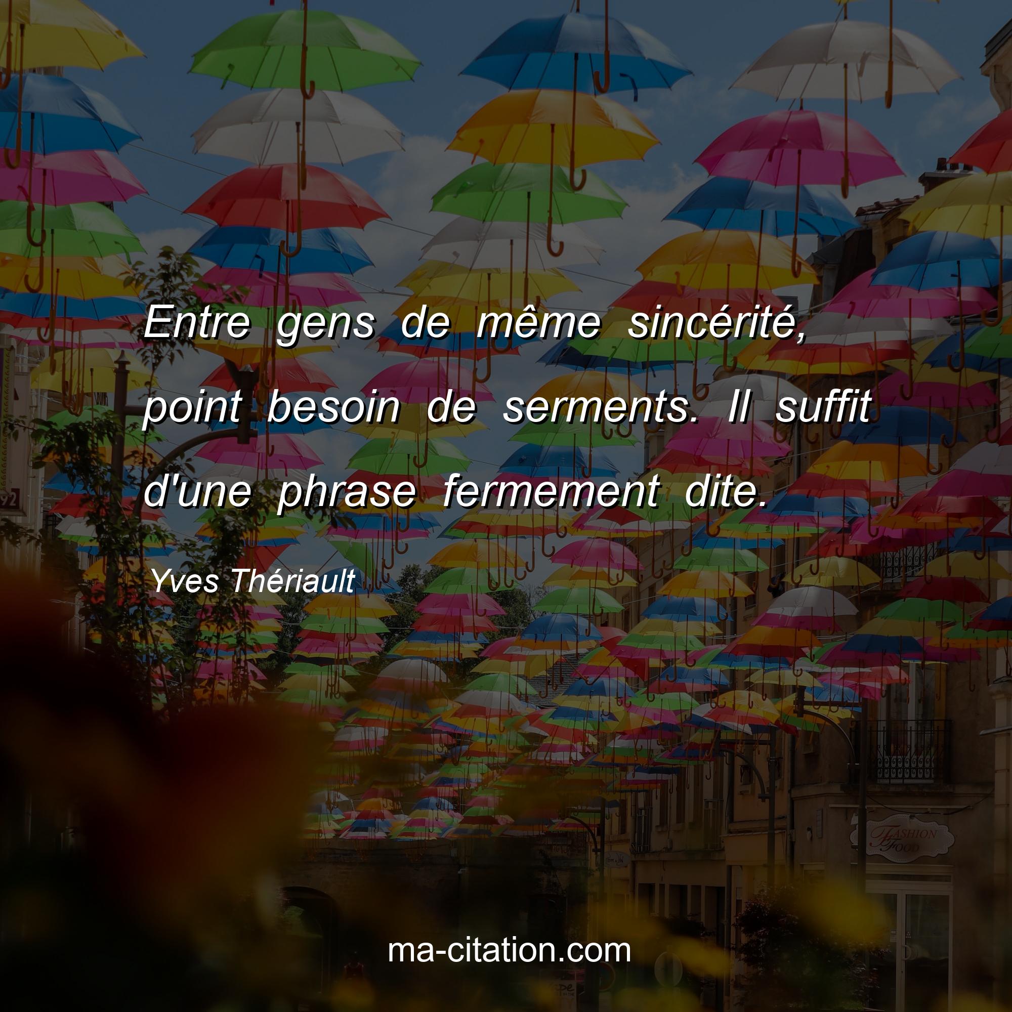 Citation sur la vie de Yves Thériault :Entre gens de même sincérité, point besoin de serments. Il suffit d'une phrase fermement dite.