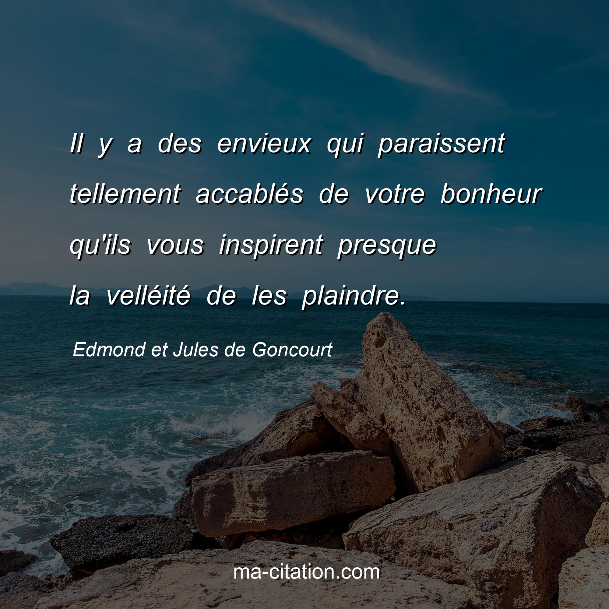 Edmond et Jules de Goncourt est l'auteur de la citation sur la vie "Il y a des envieux qui paraissent tellement accablés de votre bonheur qu'ils vous inspirent presque la velléité de les plaindre.".