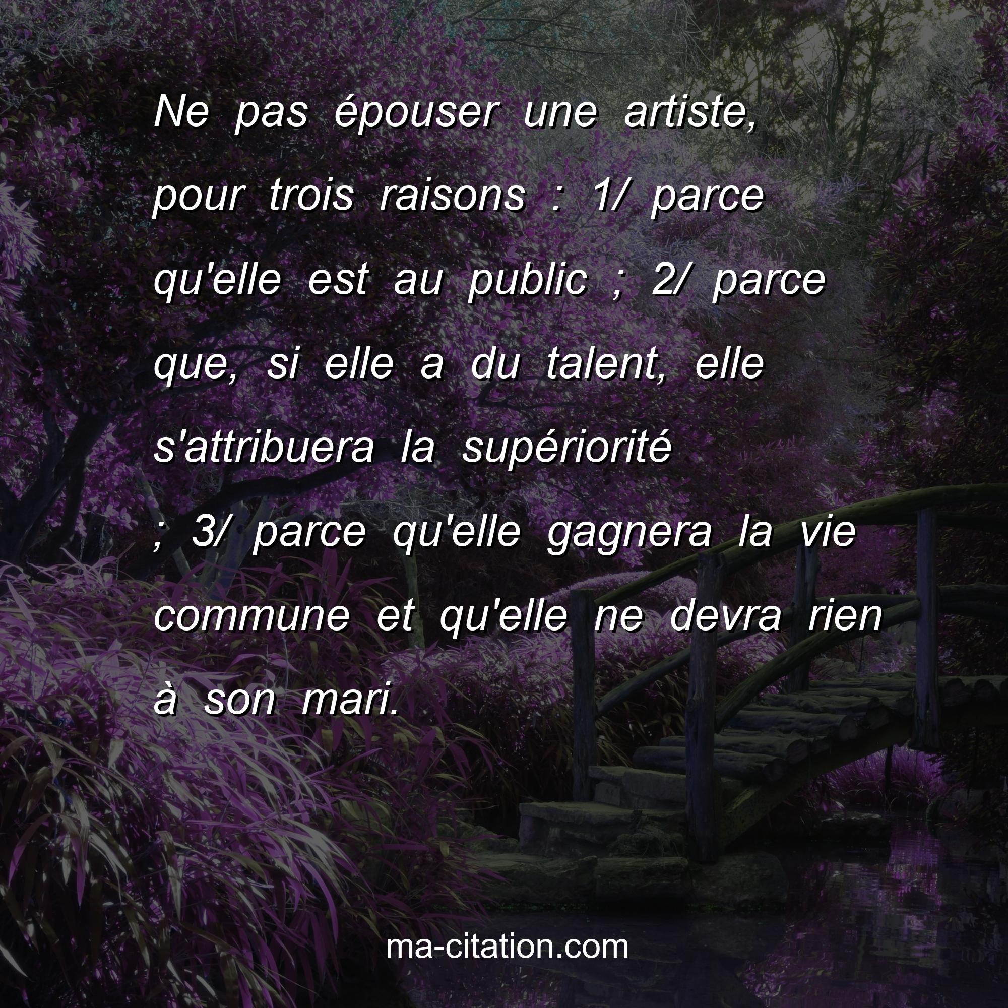 Ne pas épouser une artiste, pour trois raisons : 1/ parce qu'elle est au public ; 2/ parce que, si elle a du talent, elle s'attribuera la supériorité ; 3/ parce qu'elle gagnera la vie commune et qu'elle ne devra rien à son mari.