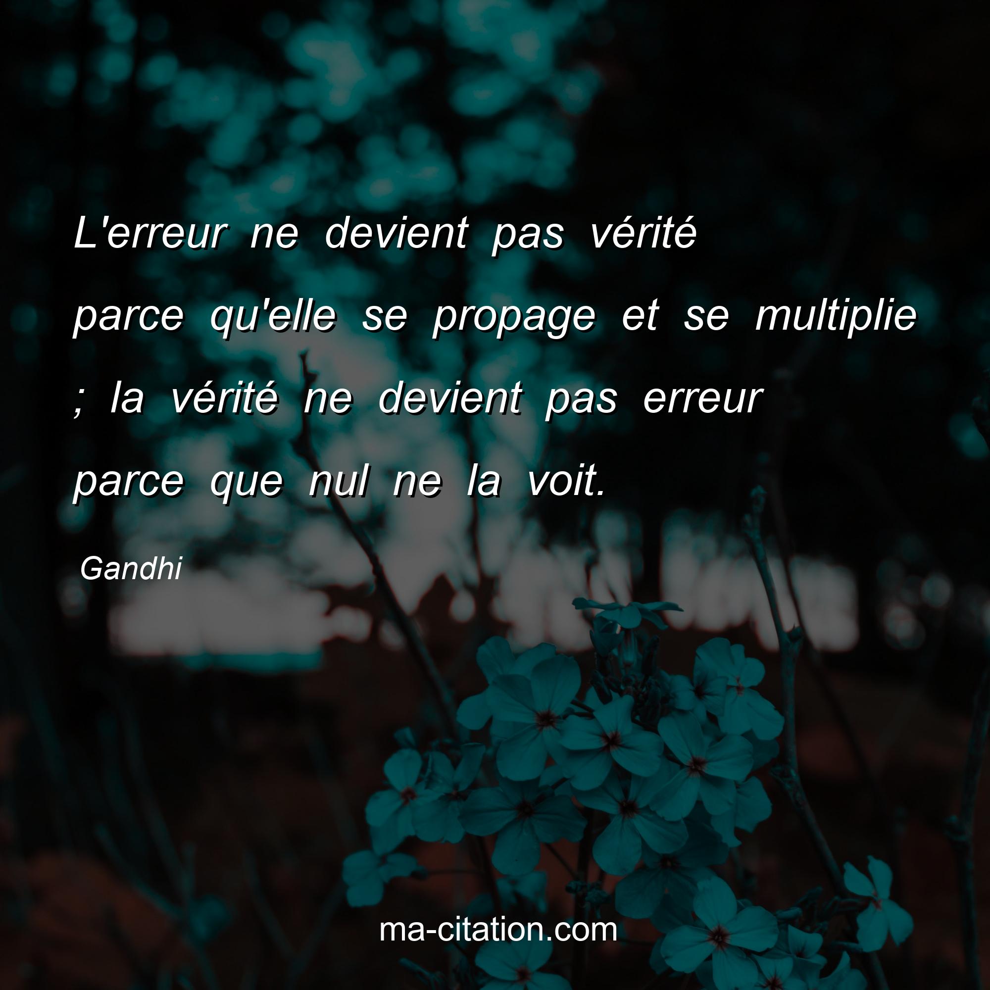 Citation sur la vie de Gandhi :L'erreur ne devient pas vérité parce qu'elle se propage et se multiplie ; la vérité ne devient pas erreur parce que nul ne la voit.