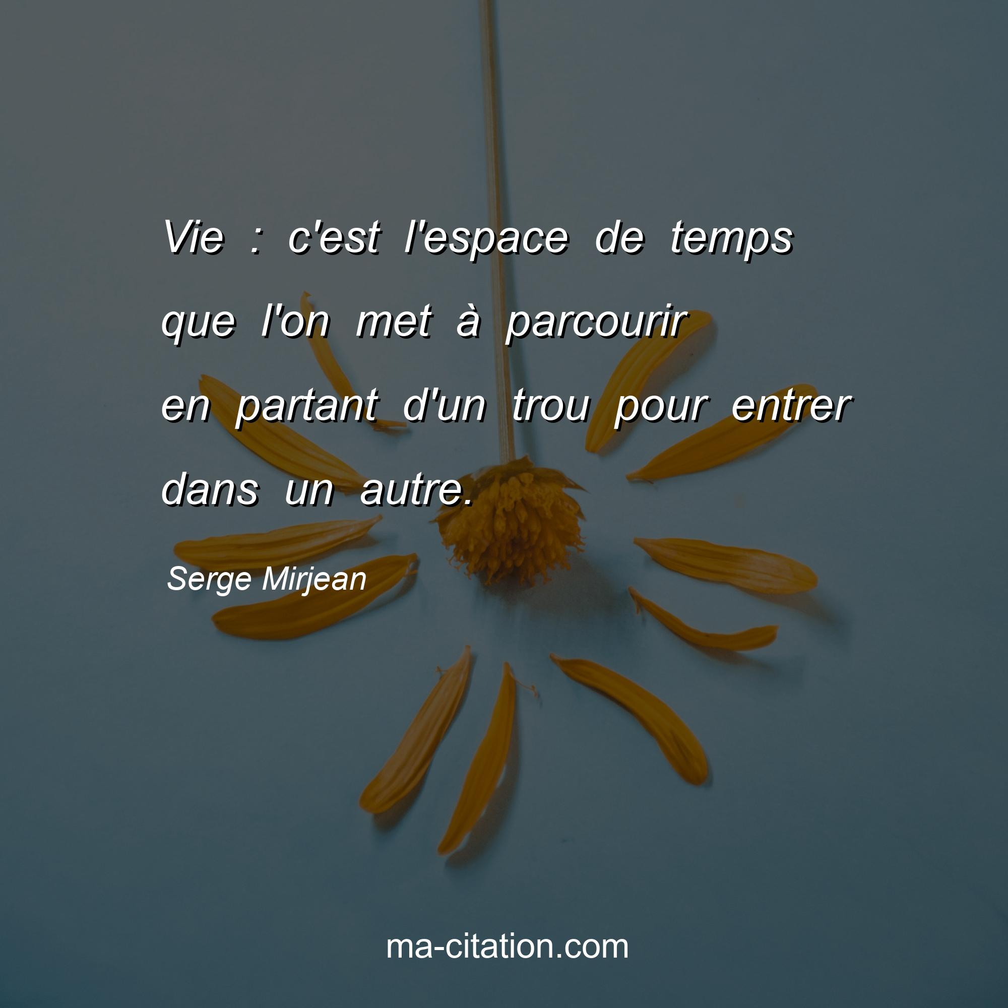 Citation sur la vie de Serge Mirjean :Vie : c'est l'espace de temps que l'on met à parcourir en partant d'un trou pour entrer dans un autre.