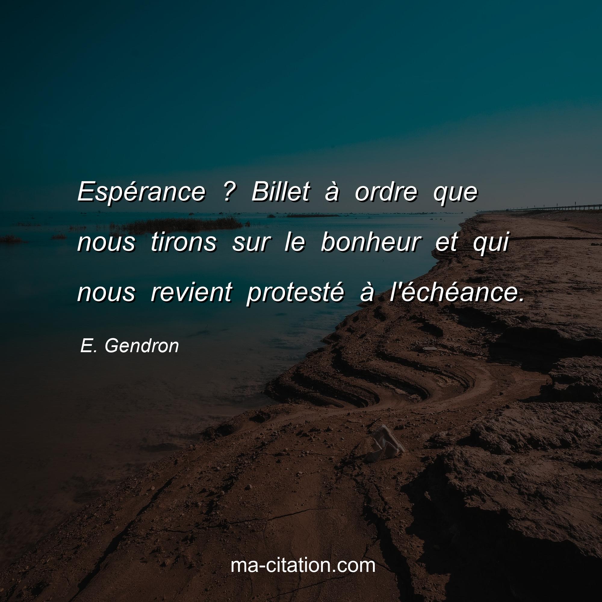 E. Gendron est l'auteur de la citation sur la vie "Espérance ? Billet à ordre que nous tirons sur le bonheur et qui nous revient protesté à l'échéance.".