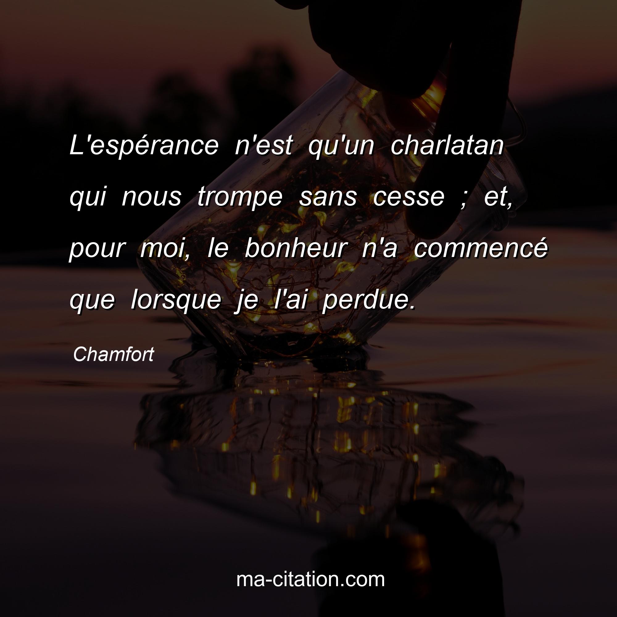 Citation sur la vie de Chamfort :L'espérance n'est qu'un charlatan qui nous trompe sans cesse ; et, pour moi, le bonheur n'a commencé que lorsque je l'ai perdue.