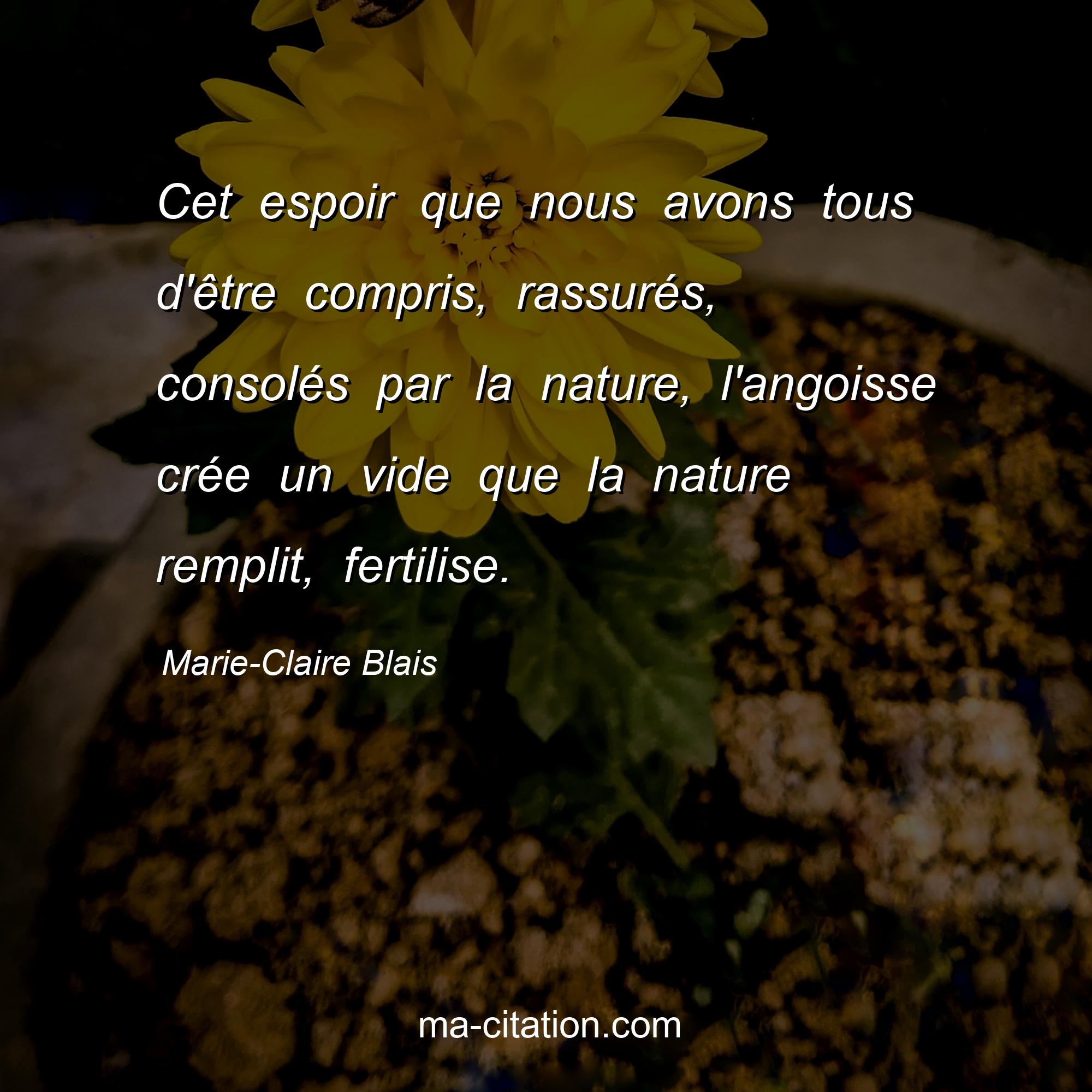Citation sur la vie de Marie-Claire Blais :Cet espoir que nous avons tous d'être compris, rassurés, consolés par la nature, l'angoisse crée un vide que la nature remplit, fertilise.
