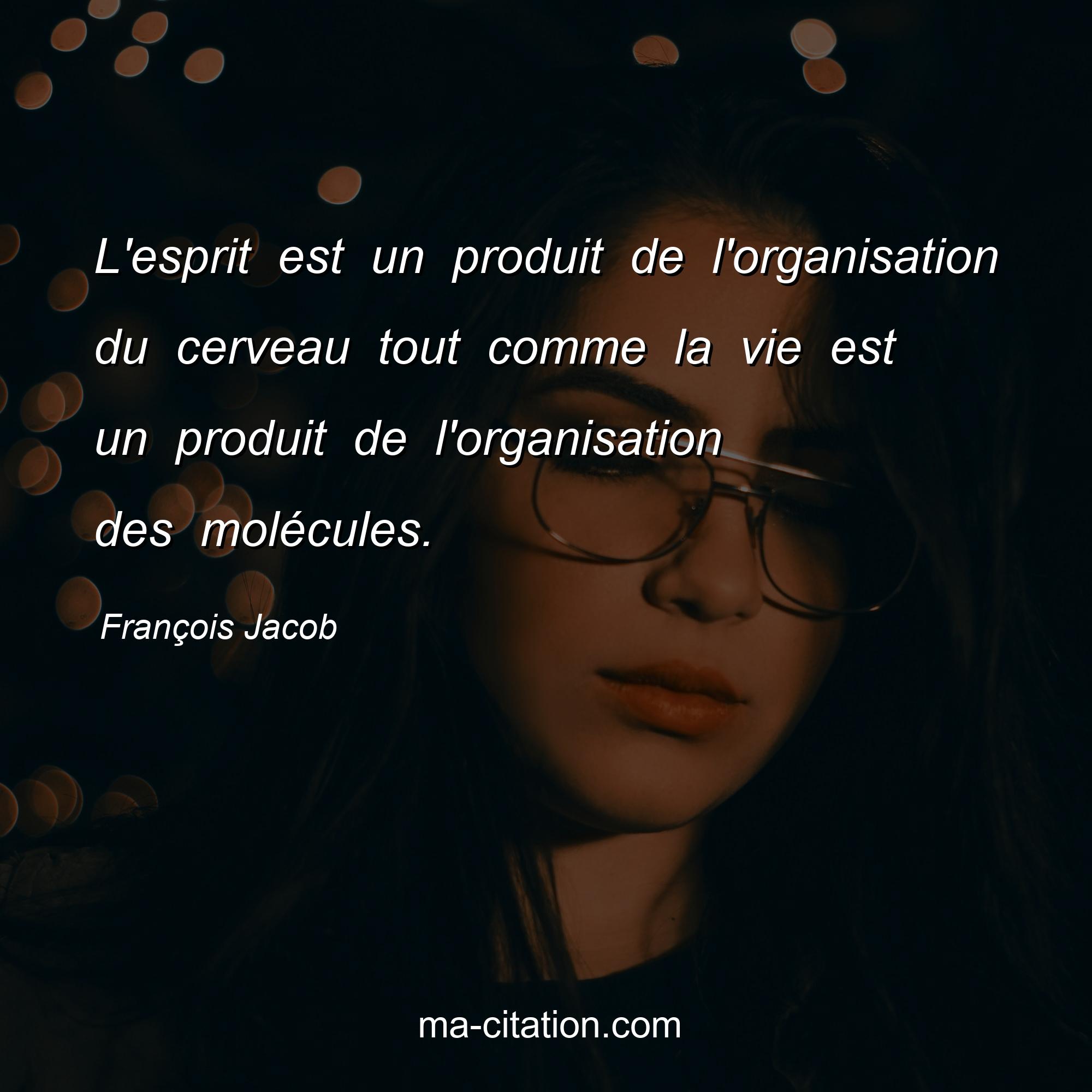 Citation sur la vie de François Jacob :L'esprit est un produit de l'organisation du cerveau tout comme la vie est un produit de l'organisation des molécules.