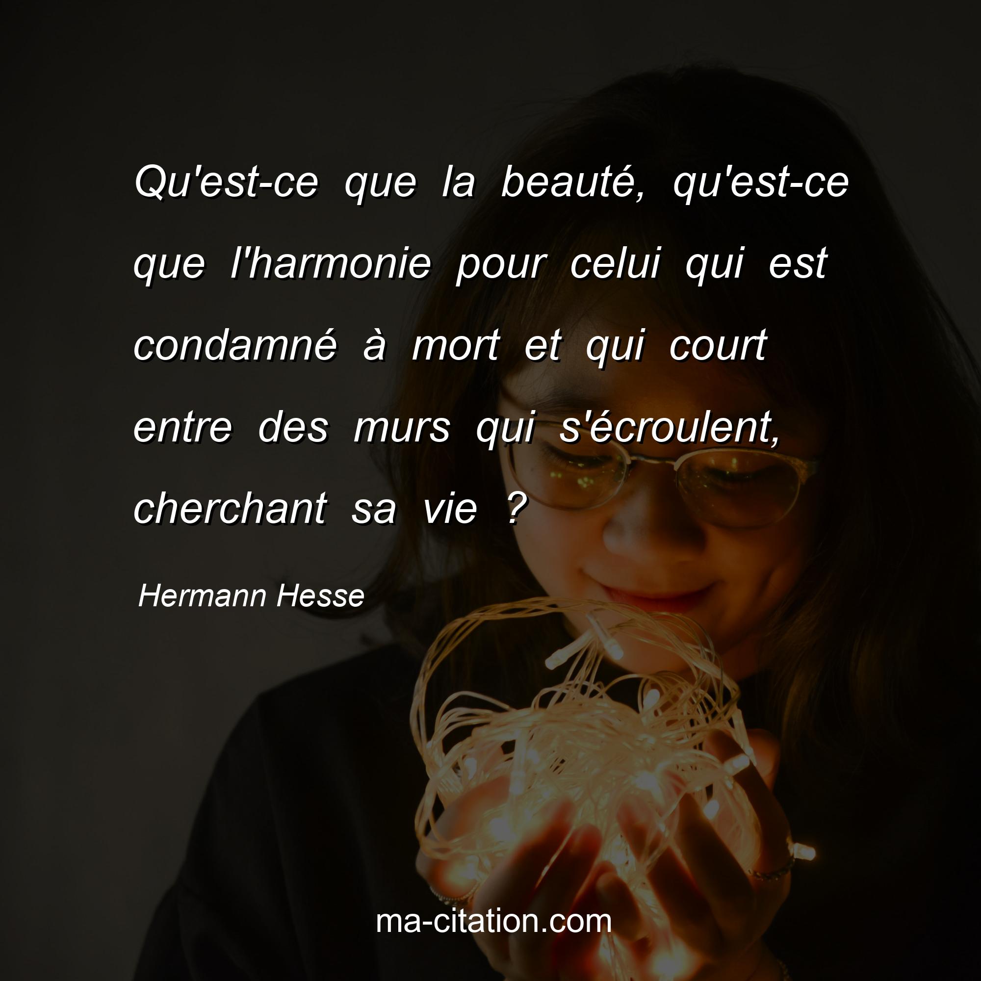 Citation sur la vie de Hermann Hesse :Qu'est-ce que la beauté, qu'est-ce que l'harmonie pour celui qui est condamné à mort et qui court entre des murs qui s'écroulent, cherchant sa vie ?
