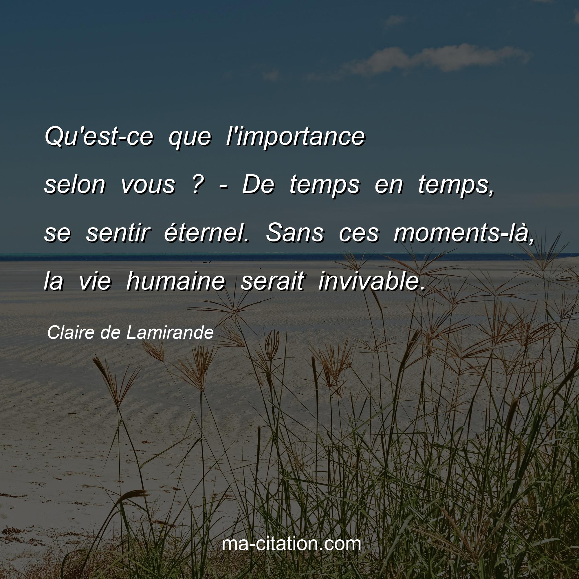 Claire de Lamirande est l'auteur de la citation sur la vie "Qu'est-ce que l'importance selon vous ? - De temps en temps, se sentir éternel. Sans ces moments-là , la vie humaine serait invivable.".
