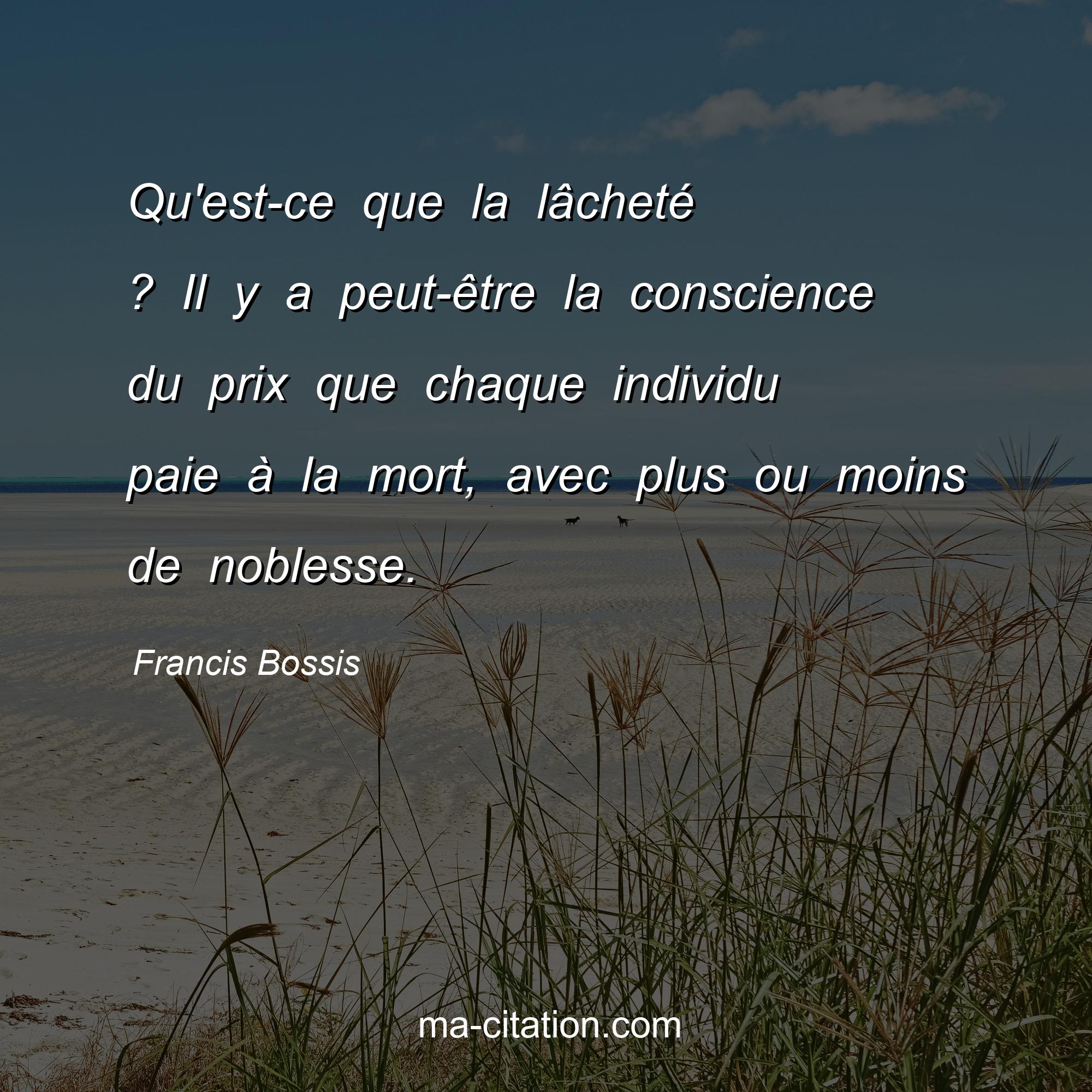 Francis Bossis est l'auteur de la citation sur la vie "Qu'est-ce que la lâcheté ? Il y a peut-être la conscience du prix que chaque individu paie à la mort, avec plus ou moins de noblesse.".