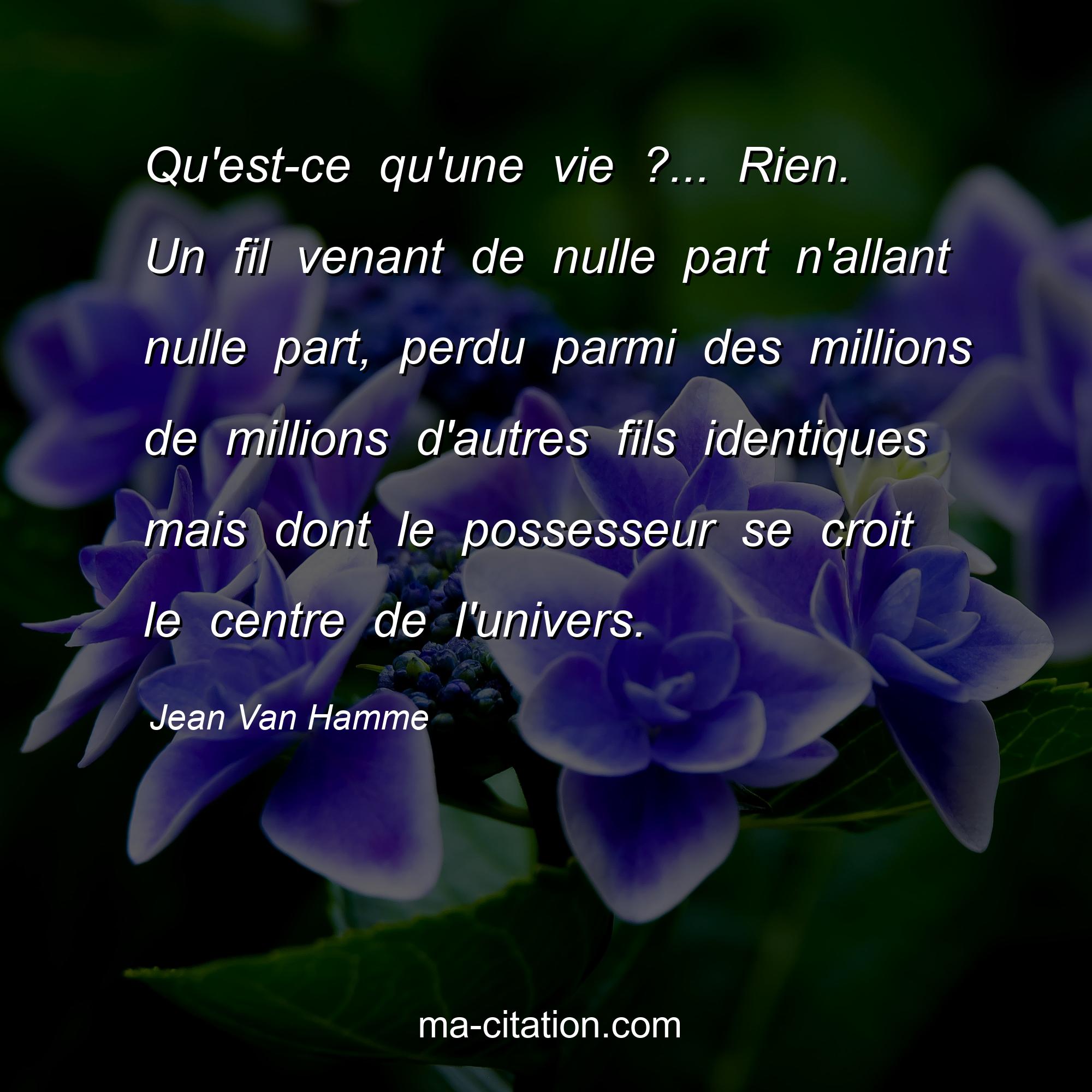 Citation sur la vie de Jean Van Hamme :Qu'est-ce qu'une vie ?... Rien. Un fil venant de nulle part n'allant nulle part, perdu parmi des millions de millions d'autres fils identiques mais dont le possesseur se croit le centre de l'univers.
