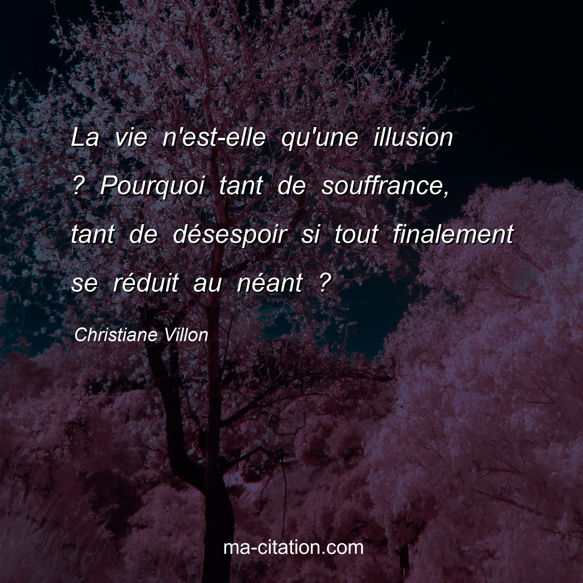 Christiane Villon est l'auteur de la citation sur la vie "La vie n'est-elle qu'une illusion ? Pourquoi tant de souffrance, tant de désespoir si tout finalement se réduit au néant ?".