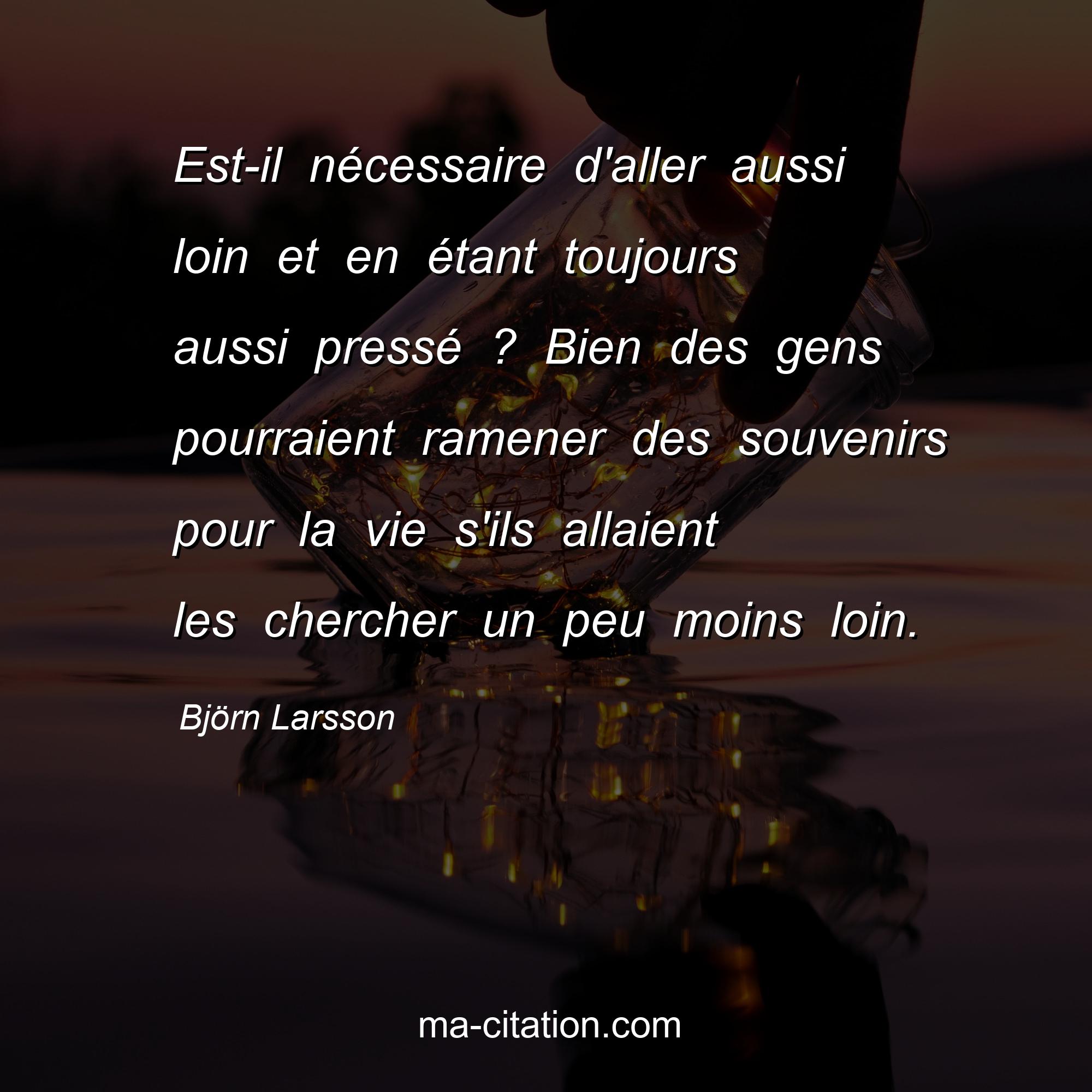 Björn Larsson est l'auteur de la citation sur la vie "Est-il nécessaire d'aller aussi loin et en étant toujours aussi pressé ? Bien des gens pourraient ramener des souvenirs pour la vie s'ils allaient les chercher un peu moins loin.".