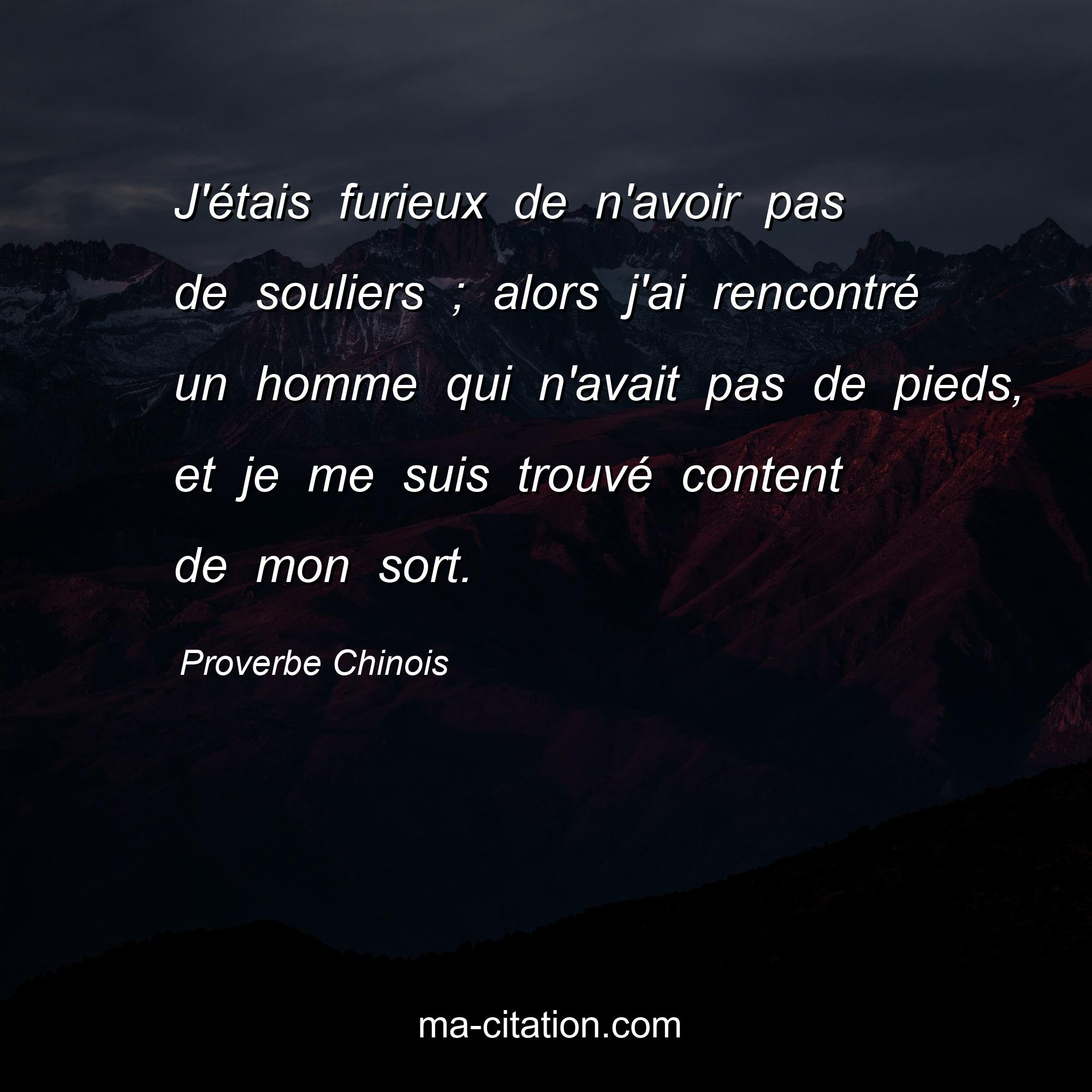 Proverbe Chinois sur la vie :J'étais furieux de n'avoir pas de souliers ; alors j'ai rencontré un homme qui n'avait pas de pieds, et je me suis trouvé content de mon sort.