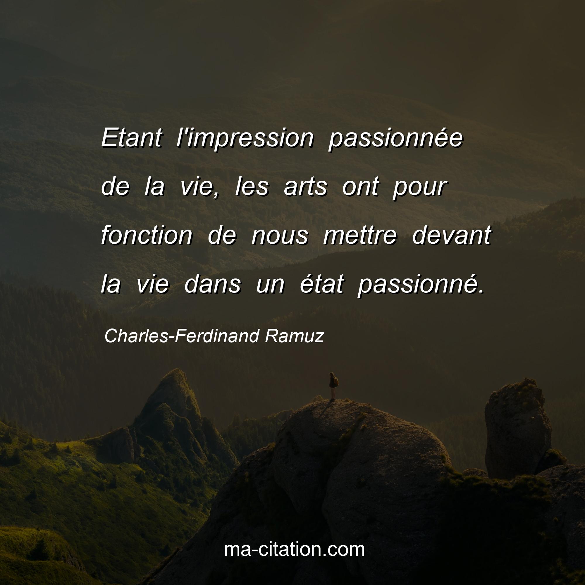 Citation sur la vie de Charles-Ferdinand Ramuz :Etant l'impression passionnée de la vie, les arts ont pour fonction de nous mettre devant la vie dans un état passionné.