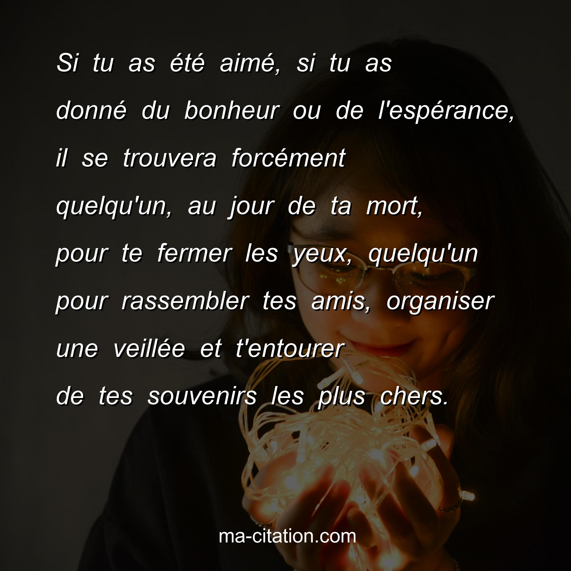Si tu as été aimé, si tu as donné du bonheur ou de l'espérance, il se trouvera forcément quelqu'un, au jour de ta mort, pour te fermer les yeux, quelqu'un pour rassembler tes amis, organiser une veillée et t'entourer de tes souvenirs les plus chers.