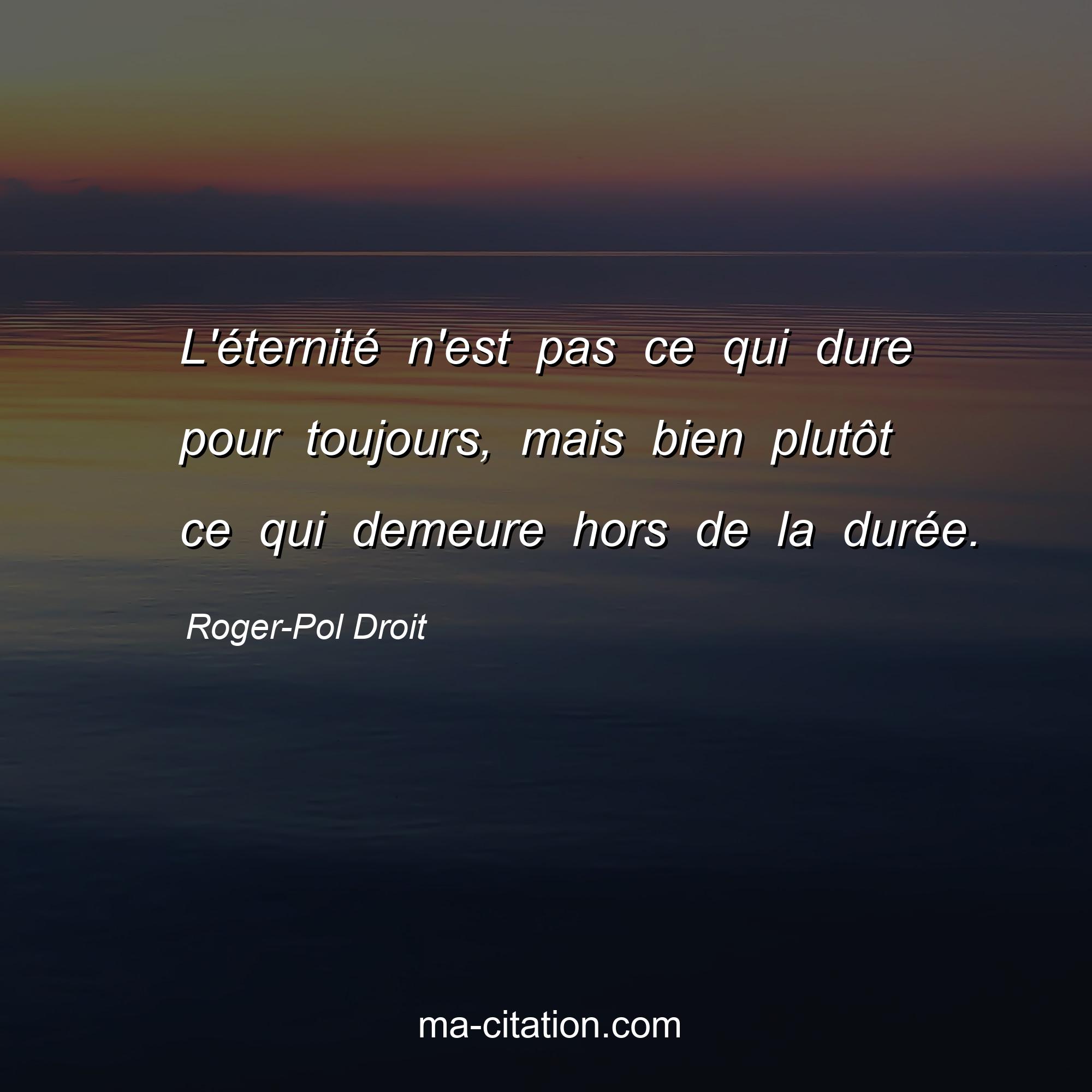 Citation sur la vie de Roger-Pol Droit :L'éternité n'est pas ce qui dure pour toujours, mais bien plutôt ce qui demeure hors de la durée.