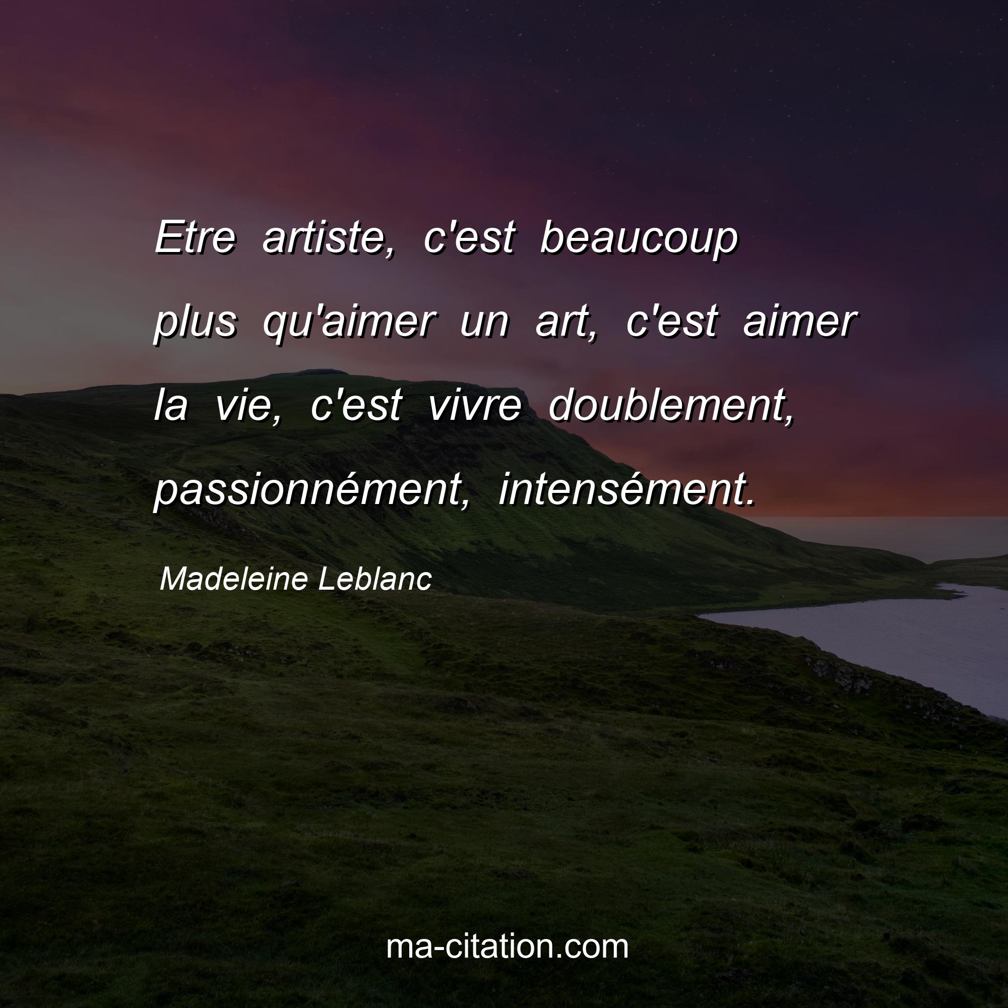 Madeleine Leblanc est l'auteur de la citation sur la vie "Etre artiste, c'est beaucoup plus qu'aimer un art, c'est aimer la vie, c'est vivre doublement, passionnément, intensément.".